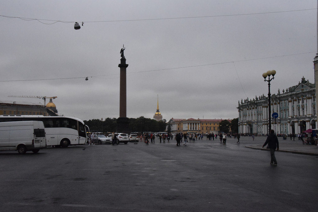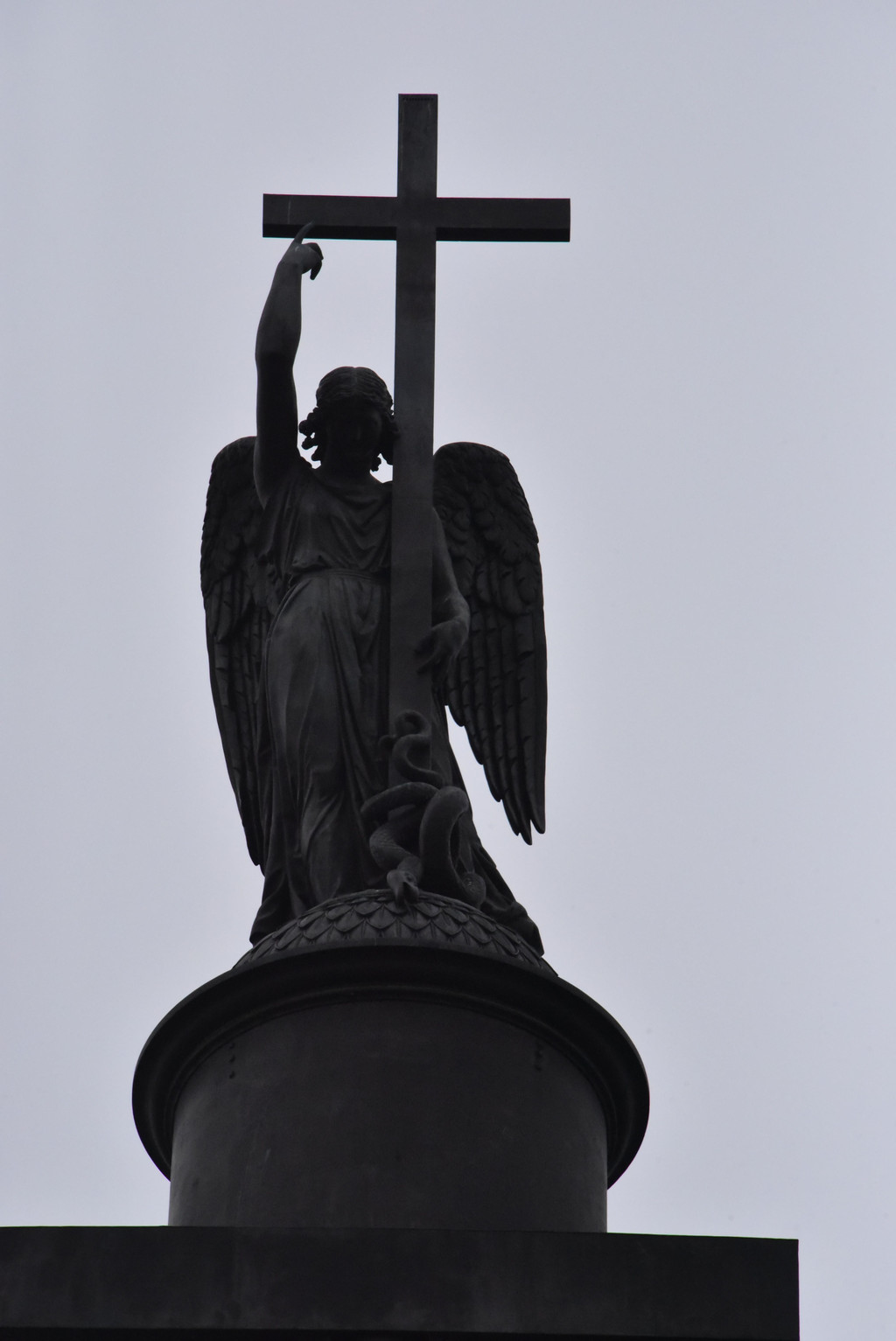 冬宫广场,也是冬宫的后门,这里有一个环抱式大厦与冬宫后门相对,广场中心矗立一个高大的柱子称为亚历山大二世柱,柱顶是一个怀抱十字架的天使,十字架压在一条蛇的身上。