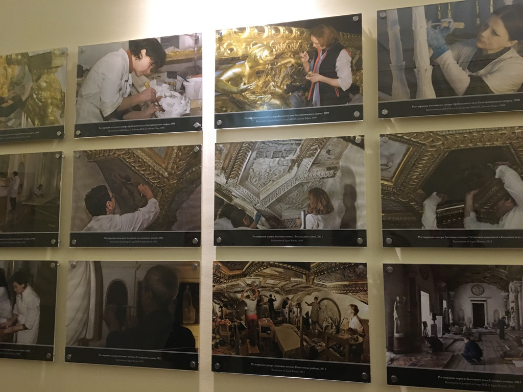 宫殿中展示了战争中宫殿被毁时惨状的照片,宫殿修复过程的照片,