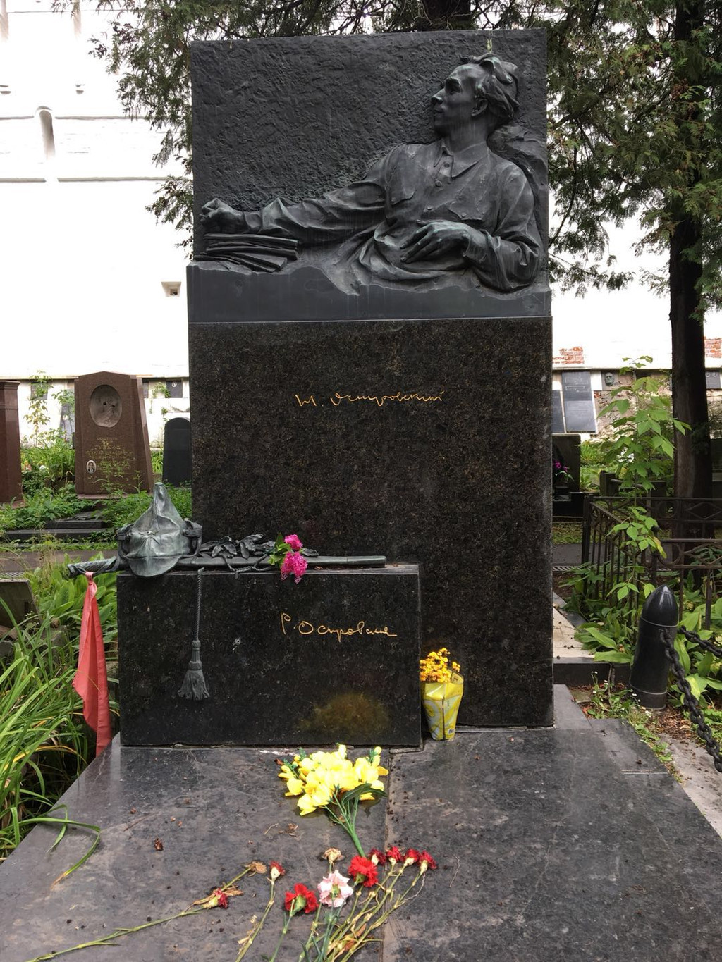 《钢铁是怎样炼成的》小说作者奥斯特洛夫斯基的墓,这可是我一直想见的英雄,黑色大理石墓碑上的奥斯特洛夫斯基雕塑斜靠在病床上,右手下压着的是他著名的小说书稿,那时他已双目失明瘫痪在床了,墓碑下方有一个小墓碑,上面的雕塑是一顶红军帽和一把战刀,上面的文字如果我没有猜错应该是他小说中以他为原型的主人公保尔柯察金,上中学时他小说中的一段话我曾作为座右铭抄写在笔记本上:人最宝贵的是生命。生命属于人只有一次。人的一生应当这样度过:当回忆往事的时候,他不会因为虚度年华而悔恨,也不会因为碌碌无为而羞愧,在临死时候,他就能够说:“我的整个生命和全部精力,都已经献给了世界最壮丽的事业——为人类的解放而斗争”。这是我们那一代人抹不去的英雄情怀。