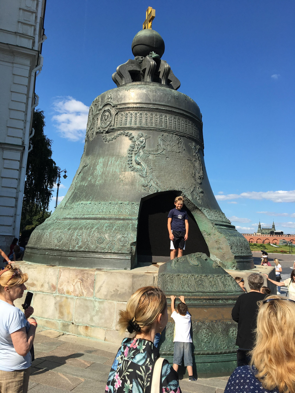 教堂广场的另一个出口矗立着一个高81米的白石头建筑的钟楼-伊凡大帝钟楼,这曾经是莫斯科最高建筑。钟楼旁地上放置着一个大钟,这就是钟王,建于1733年,钟王重200多吨,比中国的永乐大钟重4倍,大钟高6.14米,最大直径6.60米,人站在旁边显得很渺小,大钟制造过程中场地失火,救火时将冷水泼到还未完全冷却的大钟上,不幸碎裂掉下一块,钟王不愧是钟王,就是碎裂掉下来的这一块就重达11吨之多,原想挂到伊凡大帝钟楼上使用的大钟,现在只能当个摆设放到钟楼旁,供游人照相了。