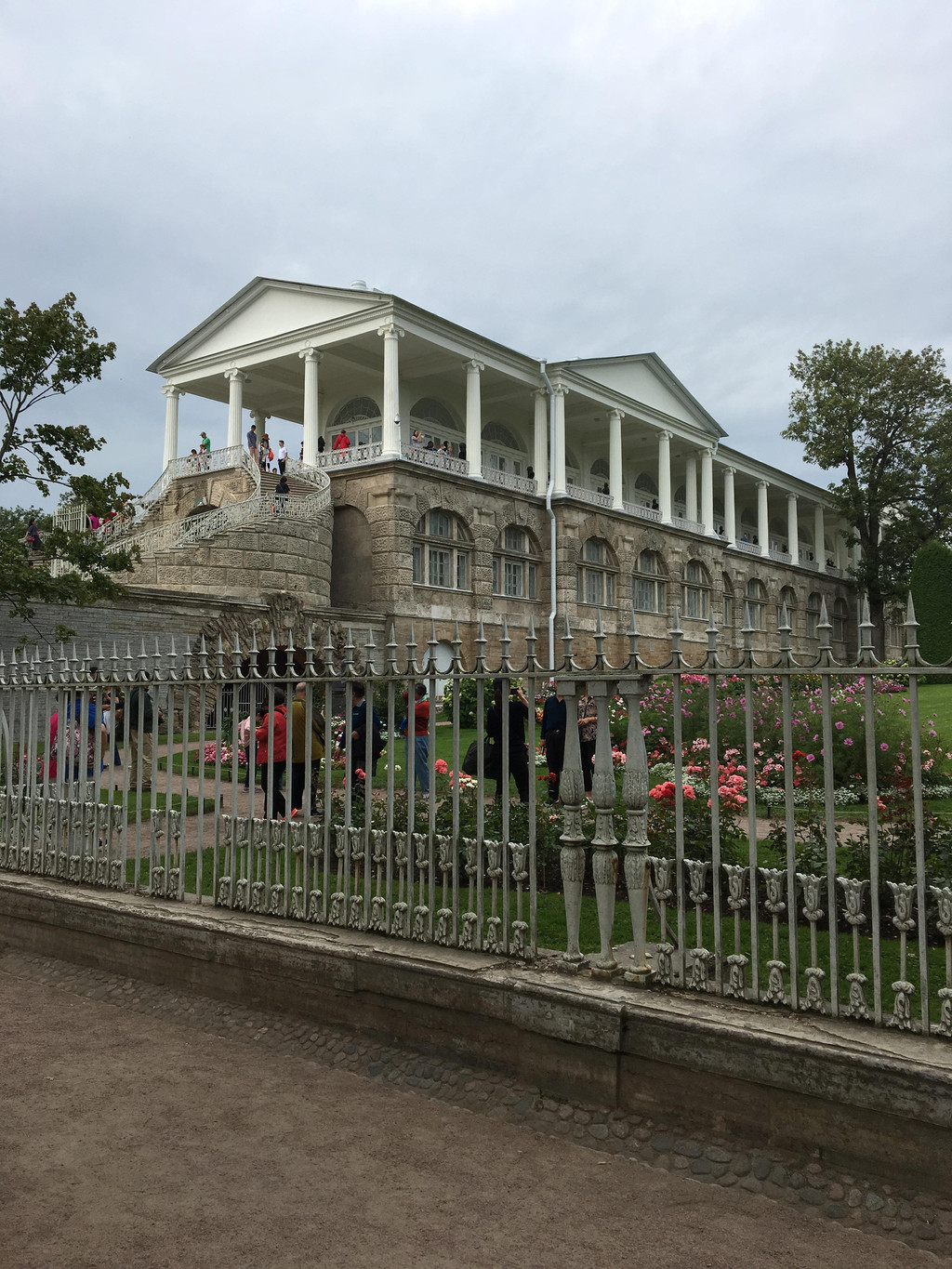 宫殿外是花园区,卡梅伦连廊,上面可以眺望前方的湖区,也可以俯瞰下面的法式花园和英式花园(区别是法式注重对称英式崇尚自然)。