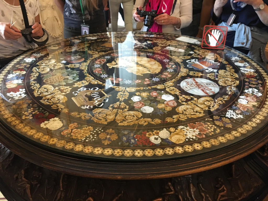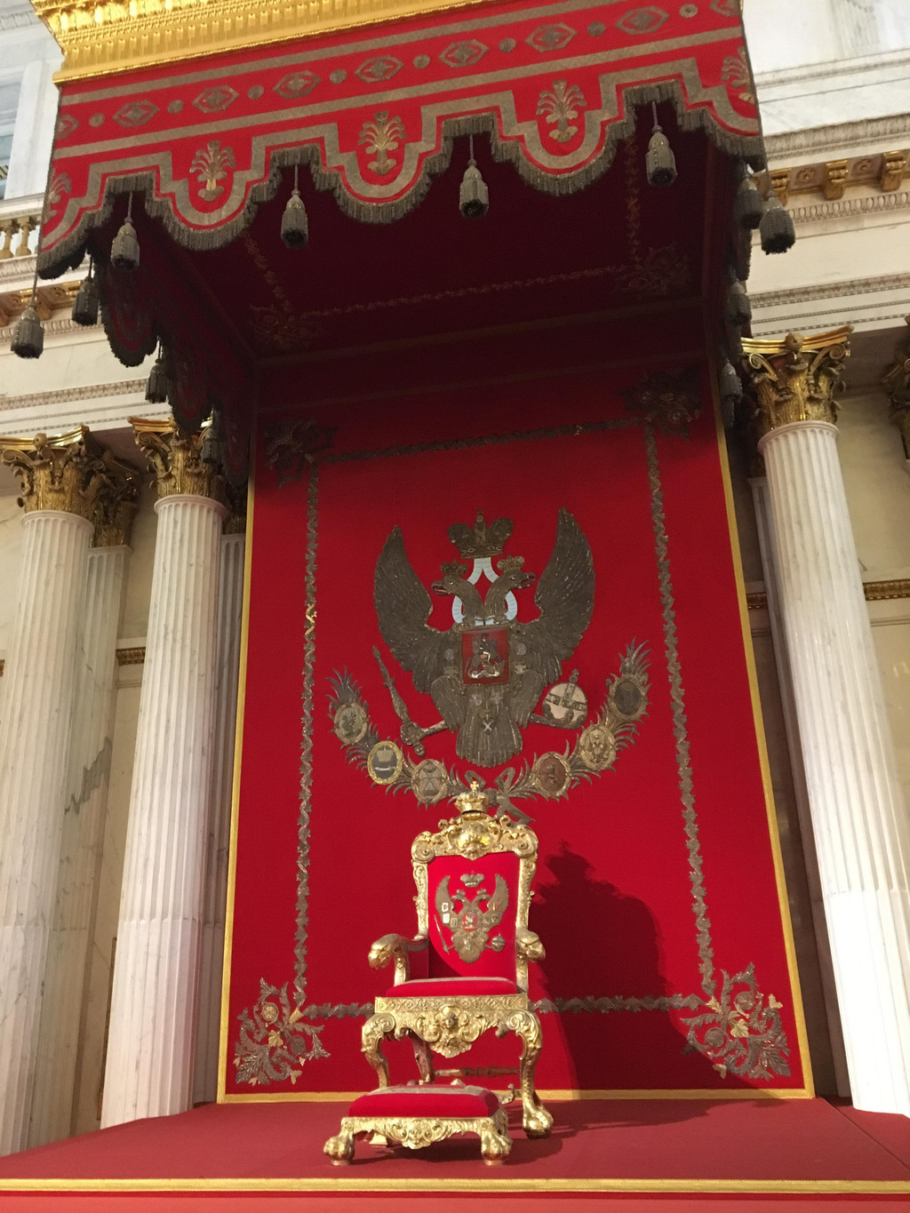 宝座厅,一个红丝绒金扶手宝座,上面用了上万颗宝石,拼成了地图图形,这是安娜伊万诺夫娜女皇宝座,她是彼得大帝的侄女(彼得同父异母哥哥伊凡五世的女儿)第七位沙皇,