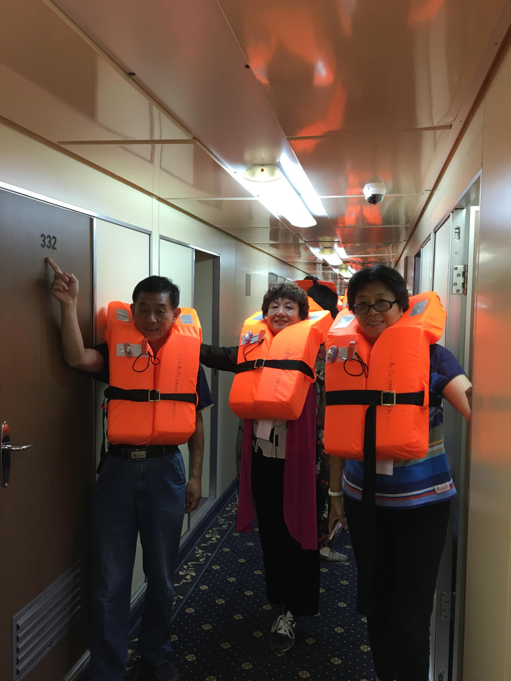 餐厅定位就坐,每天确定第二天的菜单(每道菜有三个选项),途中停靠多处游览,每天船上都会发第二天的日程安排,除了上下船时间其他时间坐卧躺走您随意,开船啦,照例第一件事是穿救生衣演习,这是关乎生命安全的大事,不能马虎。