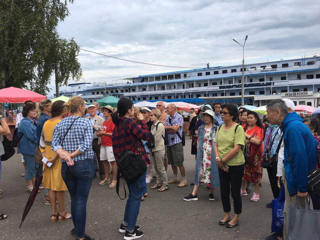 早餐自助,今天的早餐9:00-10:30,其实可以睡懒觉,为了不至于进食太多,我决定从今天起不去吃早餐,喝一杯带来的豆浆,从餐厅拿个鸡蛋,这样的早餐不会影响我一天的食欲。中午11:30游船到达乌格里奇,这里已经停靠了另外的三艘游船,岸边当地人组成的乐队卖力演奏着,一位漂亮的着俄罗斯传统服装的姑娘两手托着一盘面包,面包顶上放着盐,微笑着欢迎着每一位游客,大家都入乡随俗地取一小块面包蘸上盐放到嘴里,然后和小美眉合个影,