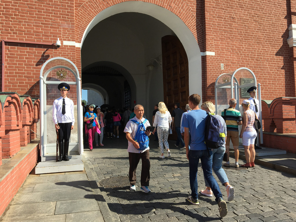 上台阶进入一个玻璃房子,这里是安检区,所有双肩背都不允许带入,走过一道桥,桥头有两个士兵站岗,可以随意和他照相,穿过门洞(就是那个高高的尖顶钟楼建筑)就进入到克里姆林宫内部,
