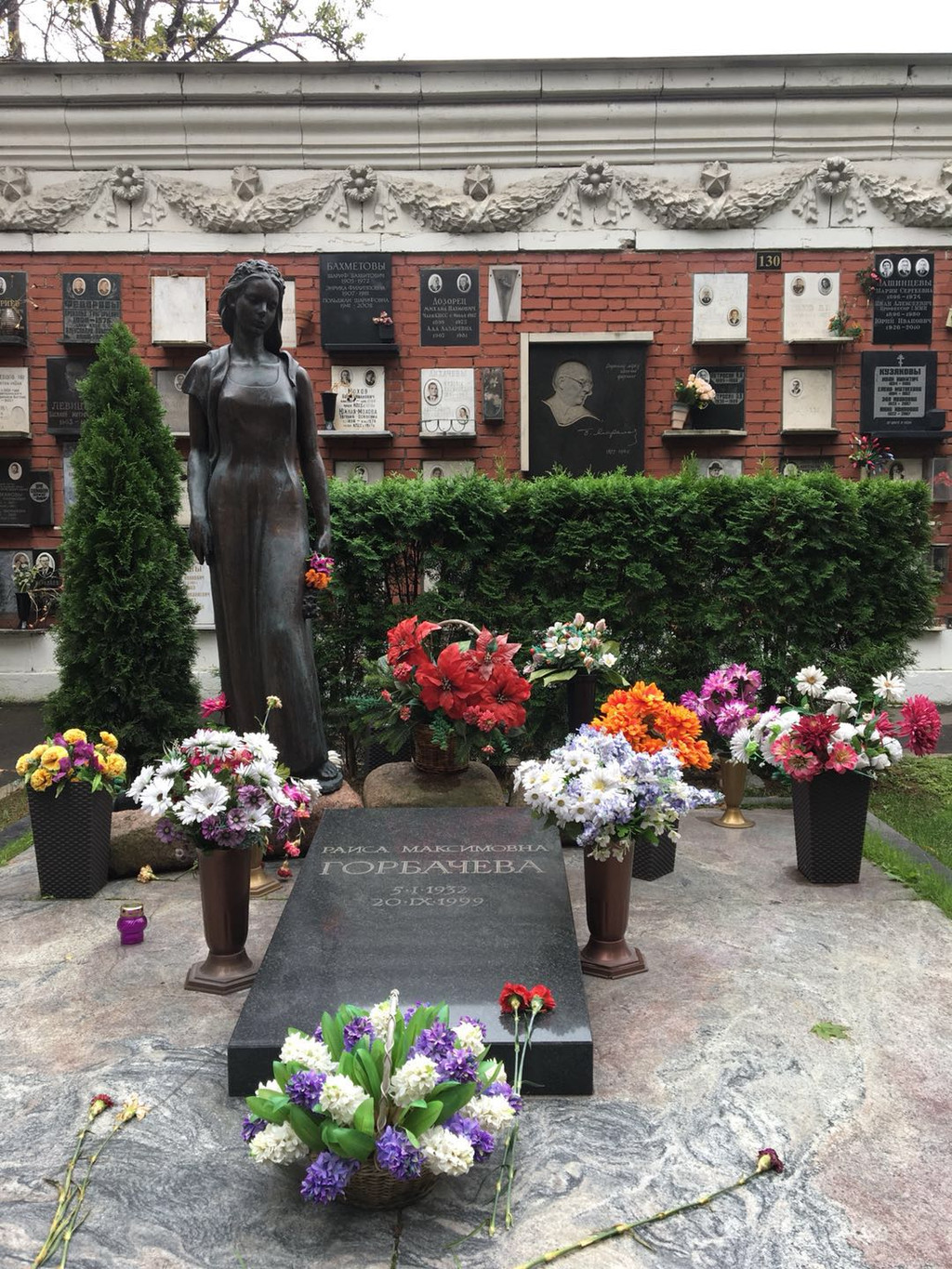 叶利钦墓的对面是戈尔巴乔夫夫人戈尔巴乔娃的墓,她曾是国家权力最大的女人,管理着国家的金银矿,政治上非常活跃,1999年9月死于白血病,生前为建立儿童白血病基金会投入心血