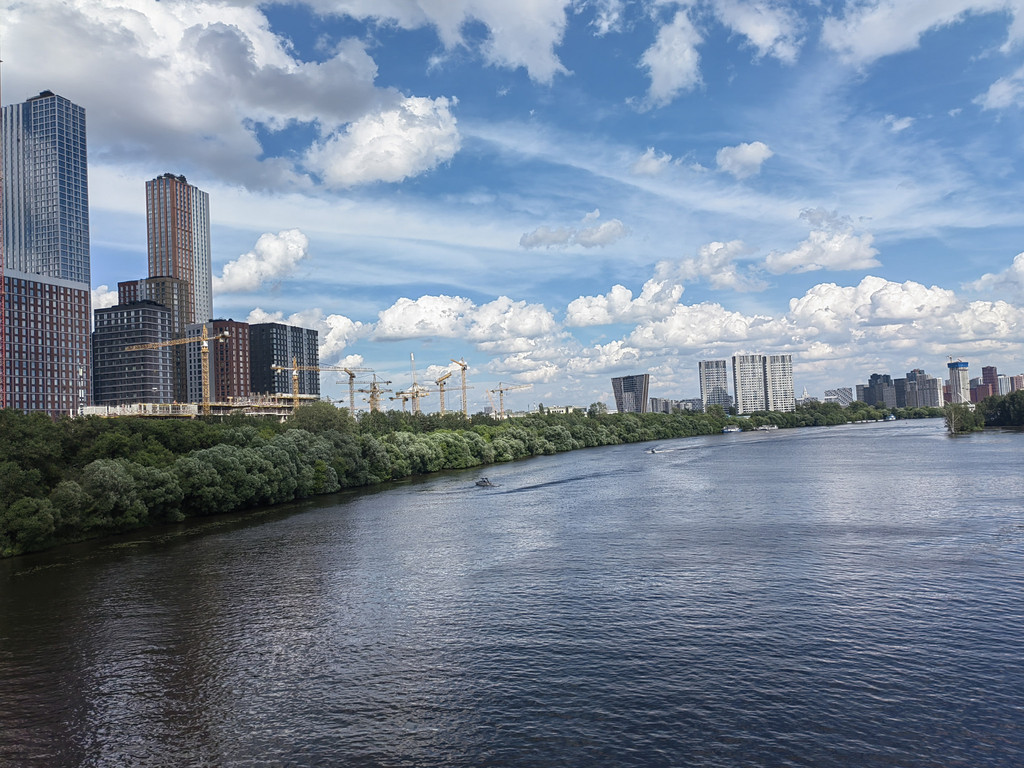 河里有人在玩摩托艇,莫斯科的天好像没有工业污染。