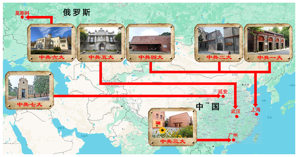 图3、中共一大至七大(新中国成立前)召开地点示意图
