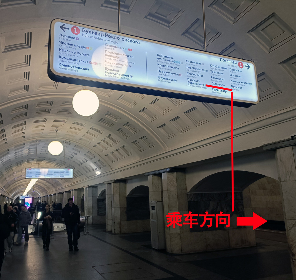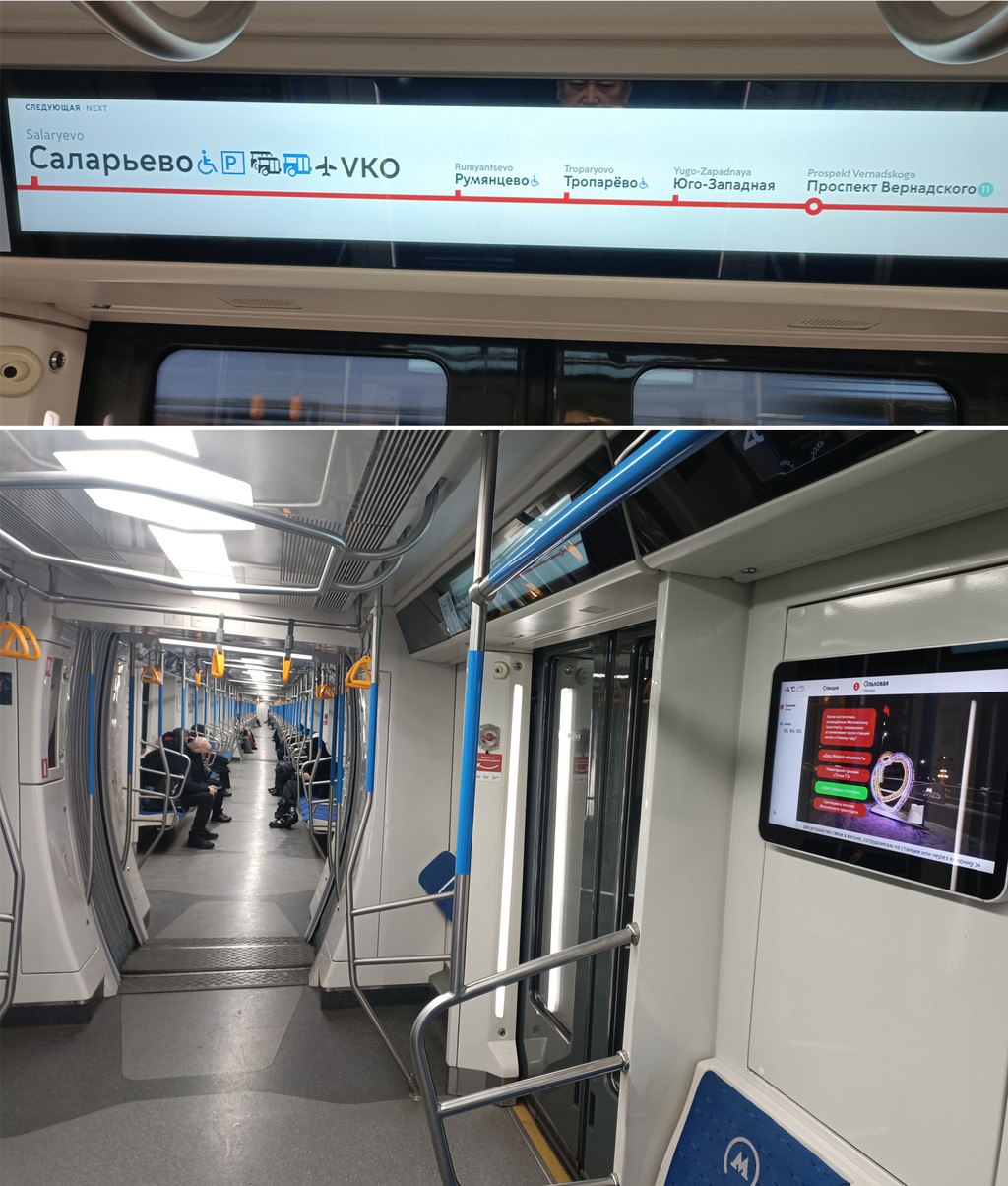 乘地铁1号线到萨拉里沃站(Саларьево)。早晨未到上班高峰,乘坐地铁的人不多。虽然听不懂俄语语音报站,但车厢内电子提示屏,告诉我离目标车站越来越近,并提示我到站下车(图12)。