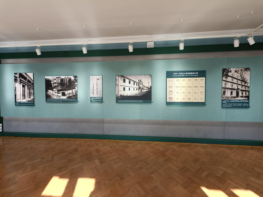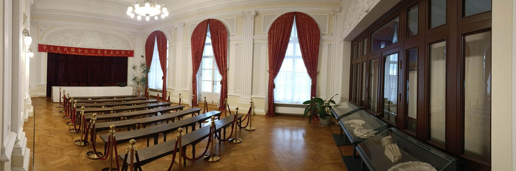 中共六大会址常设展览馆一层为六大展陈室,二层正厅为六大主会场复原展室,三层东侧北面阁楼为六大代表宿舍复原展室。