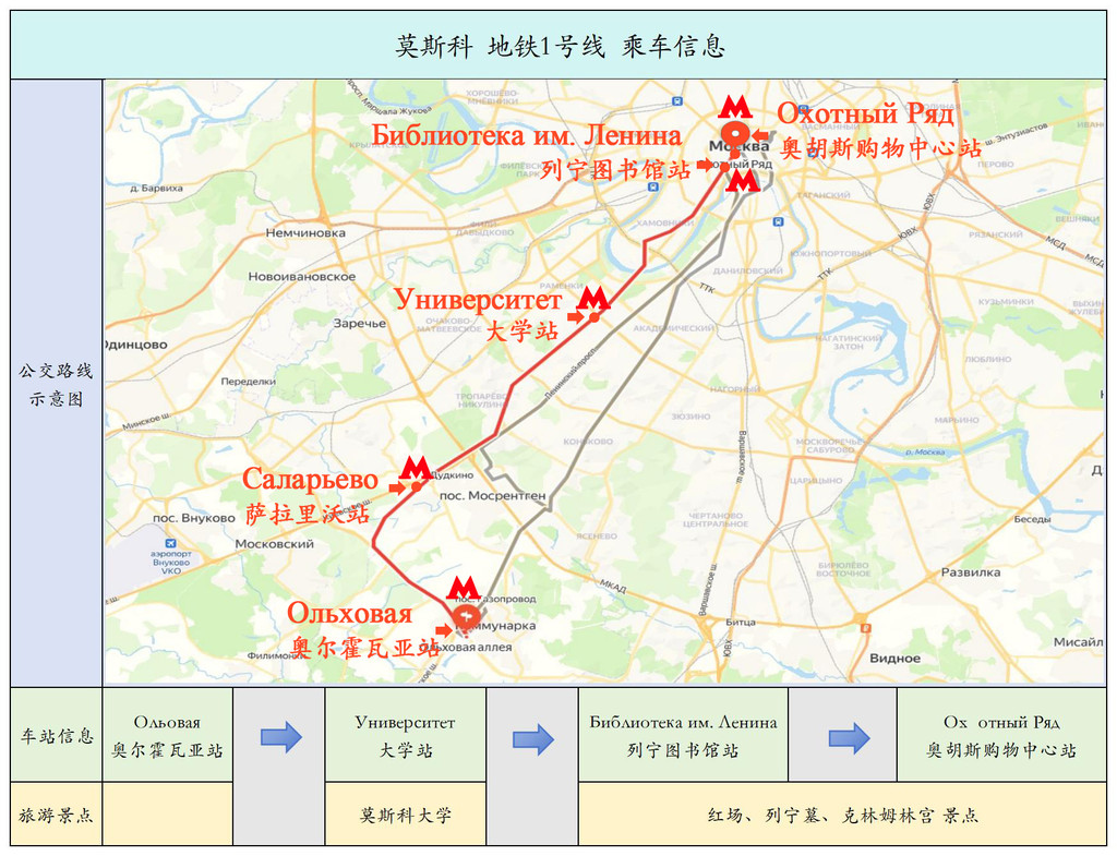 (1)、在萨拉里沃(Саларьево)换乘地铁1号线(图84)返回市区。乘地铁1号线在列宁图书馆站(Библиотека им. Ленина)或奥胡斯购物中心站(Охотный Ряд)下车,可到市中心红场、克林姆林宫参观;