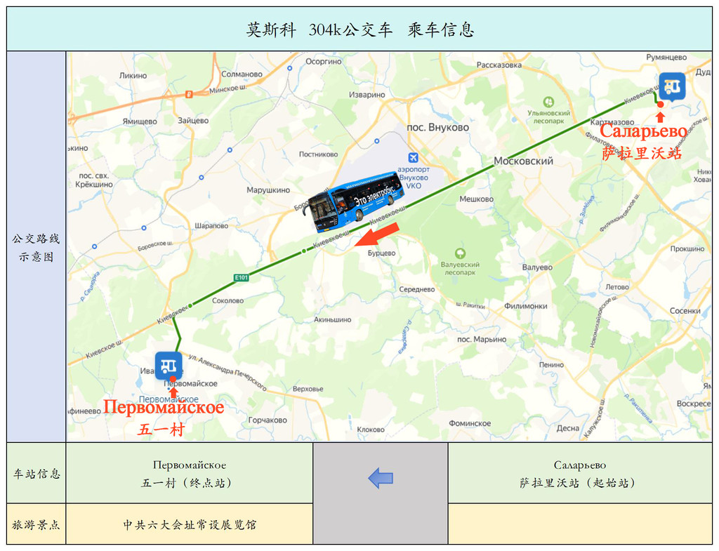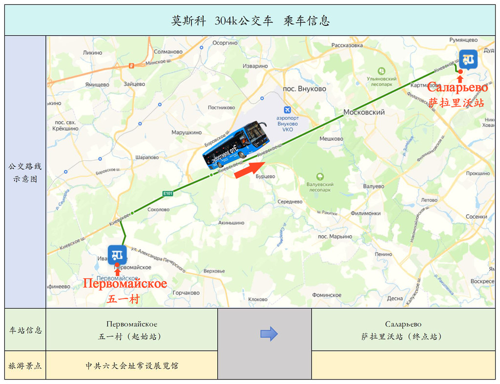 3、在萨拉里沃(Саларьево)换乘158(原304K)公交车【起始站萨拉里沃(Саларьево)—终点站五一村(Первомайское 别列外迈思蔻)】到终点站五一村下车,全程约50分钟;