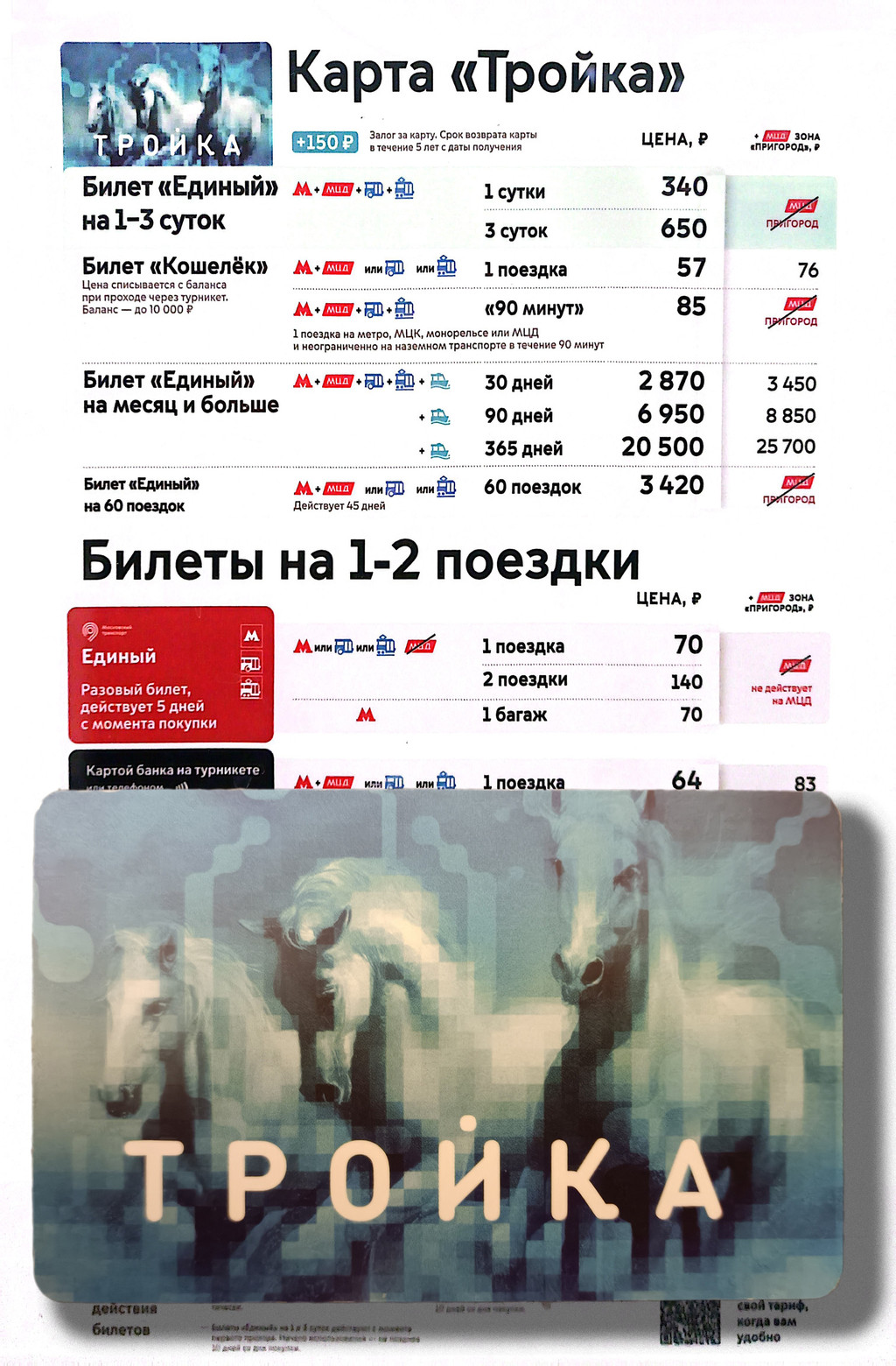 其次,到莫斯科地铁站售票窗口,购买一张交通卡。因我在莫斯科逗留时间比较长,所以购买了一张莫斯科“三套车”(Тройка)蓝色交通卡(图6),可长期使用,乘坐莫斯科市地铁、公交车、城郊火车,购卡时在卡内预充值500卢布。其他游客可根据实际情况购买按天或按乘坐次数计价交通卡。一切工作准备就绪。