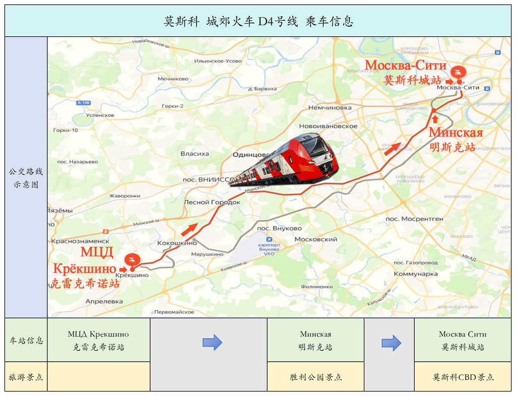 2、乘278(原875)公交车(图90)【起始站圣三一市(Троицк микрорайон"В")—途径五一村(别列外迈思蔻Первомайское)—终点站克雷克希诺站(МЦД Крекшино)】。从五一村(Первомайское别列外迈思蔻)上车,到终点站克雷克希诺站(城郊火车D4号线克雷克希诺站МЦД Крекшино)下车,换乘城郊火车D4号线(图91)返回市区。乘坐城郊火车D4号线,可在明斯克站(Минская)下车,到胜利公园Площадь победитепей参观,或在莫斯科城站(Москва Сити)下车,到莫斯科市CBD商务区参观,或以CBD为起始点,购买船票游览莫斯科河;