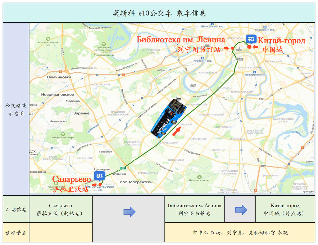 (2)、在萨拉里沃(Саларьево)换乘e10公交车(图85)【起始站萨拉里沃(Саларьево)—终点站中国城(Метро "Китай-город")】返回市区。可在列宁图书馆站(Библиотека им. Ленина)或终点站中国城(Метро "Китай-город")下车,到市中心红场、克林姆林宫参观;
