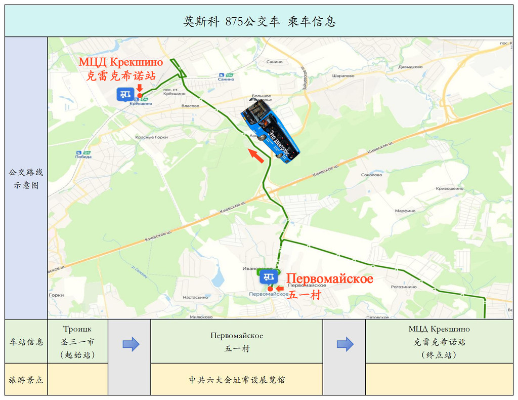 参观结束返程,查看了中共六大会址周边交通信息,找到4条线路,可以返回莫斯科市内。(提示:莫斯科公交车车头上方有电子提示牌,显示车辆行驶方向,即终点站名称。乘车前需看清车头显示牌去往终点站名称,确认车辆行驶方向后再乘车。)