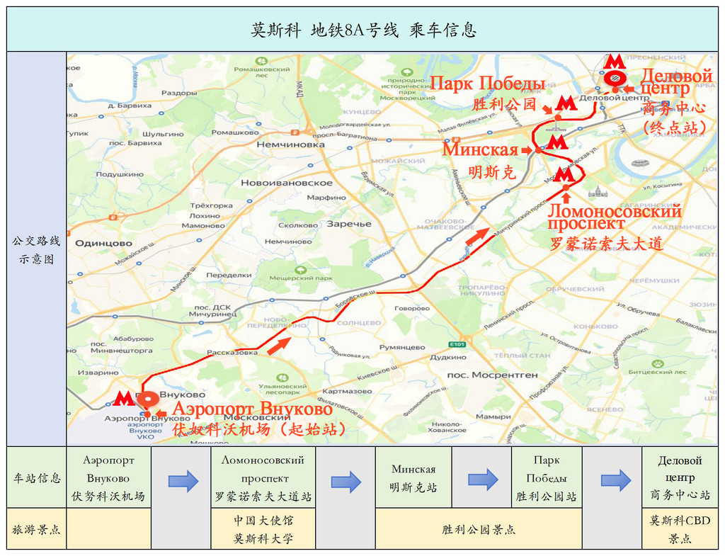 1、乘126(原526)公交车(图88)【起始站圣三一市(Троицк микрорайон"В")—途径五一村(Первомайское别列外迈思蔻)——终点站伏奴科沃机场(Аэропорт Внуково)】。从五一村(Первомайское别列外迈思蔻)上车,到终点站伏奴科沃机场站(Аэропорт Внуково)下车,换乘机场地铁8A号线(图89)返回市区。乘机场地铁8A号线,可在胜利公园站(Парк победы)下车,到胜利者广场Площадь победитепей参观,或终点站商业中心站(Деловой центр)下车,到莫斯科市CBD商务区参观,或以CBD为起始点,购买船票游览莫斯科河;