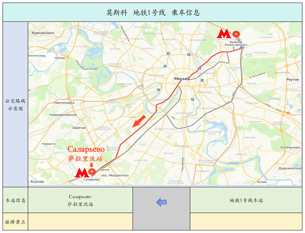 2、乘莫斯科地铁1号线到萨拉里沃站(Саларьево)下车;