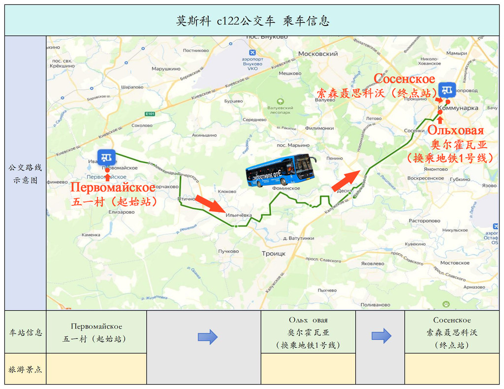 2、乘c122路公交车(图86)【起始站五一村(Первомайское别列外迈思蔻)—途径奥尔霍瓦亚(Метро"Ольховая)地铁站—终点站索森聂思科沃(Сосенское)】。从起始站五一村乘车,在奥尔霍瓦亚地铁站(Метро"Ольховая")下车,换乘地铁1号线(图87)返回市区。乘地铁1号线可在列宁图书馆站(Библиотека им. Ленина)或奥胡斯购物中心站(Охотный Ряд)下车,到市中心红场、克林姆林宫参观;