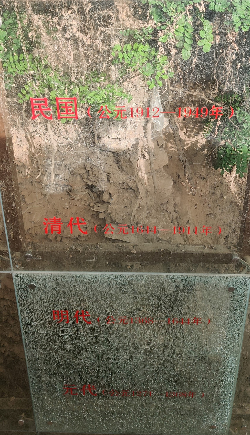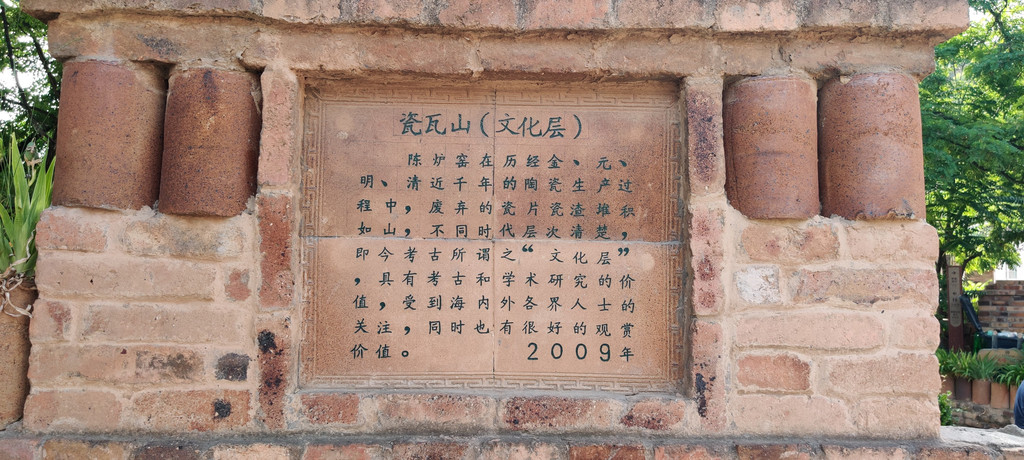 左侧小路旁偌大钢化玻璃中,保留着金、元、明、清近千年生产过程中,废弃的瓷片瓷渣,按时代层次分明,已被作为全国重点文物保护。