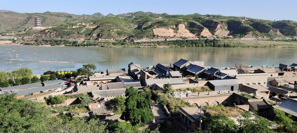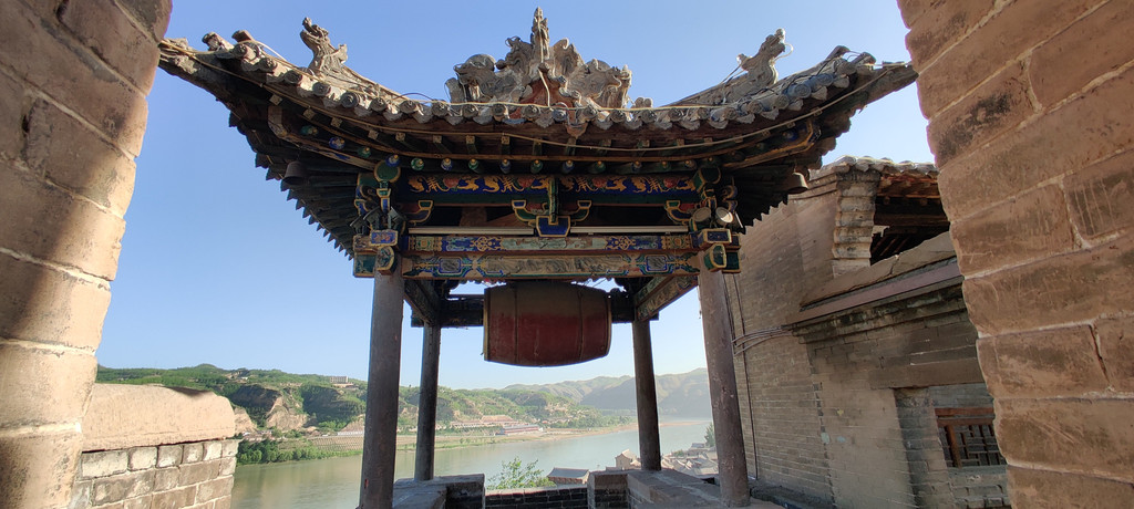 站在黑龙庙的鼓楼上,可以俯瞰碛口古镇的全貌,我们去时是枯水期,河水静静泛着绿光,没有看到黄河涛涛奔流的景象。对面就是陕西省。