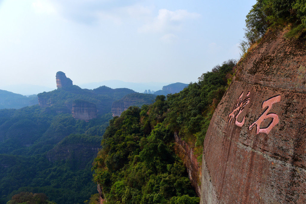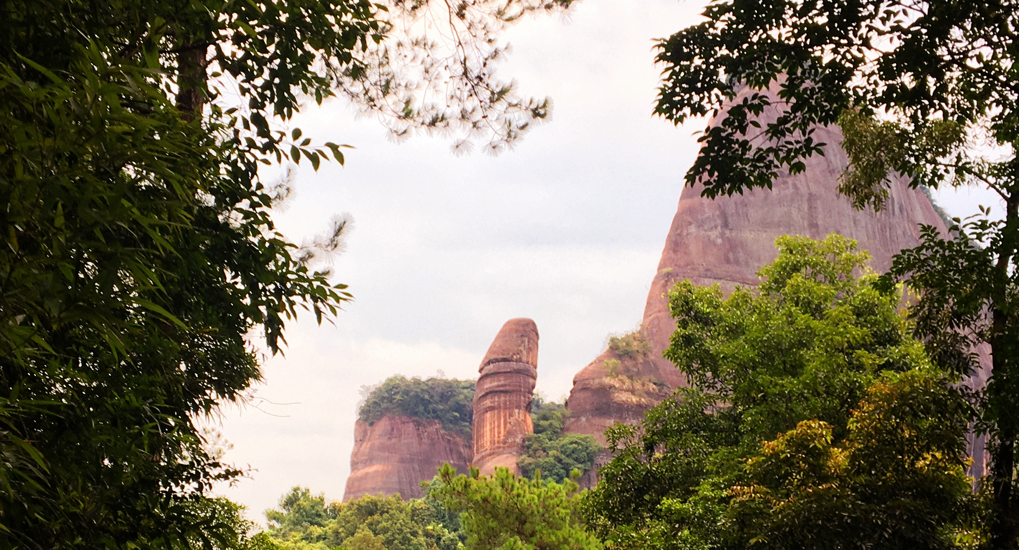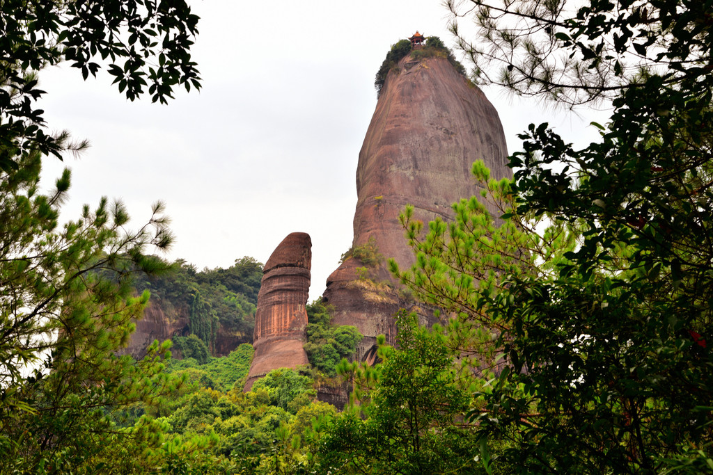 若非新冠疫情,大概不会选择暑期出门。丹霞山地处南岭山脉南侧山间盆地之中,七月末正值盛夏,风静止、热蒸腾。在阳元石景区没走几步,就已汗流浃背。远远望见那天下无双的阳元石,浑然不觉气候炎热,在阳元山旁不知疲倦地高高雄起。丹霞地貌中阳刚石柱不少,若论形似,无出其右。阳元石前面的树木比十几年前第二次来的时候长高了许多,遮住了阳元石的下半部分,因此须向上走一段石阶山道至拜阳台乃至更高的乾元亭,方能更真切地一览阳元石雄风。拜阳台的条石上放有香炉,本地人坐在一旁兜售香火。拜阳求子,至今仍有人相信。上至乾元亭,汗如雨下。向亭外望去,除了坚挺了几千万年的“天下第一奇石”,还有旁边阳元山顶的嘉遁亭孤独伫立,无人上去陪伴。