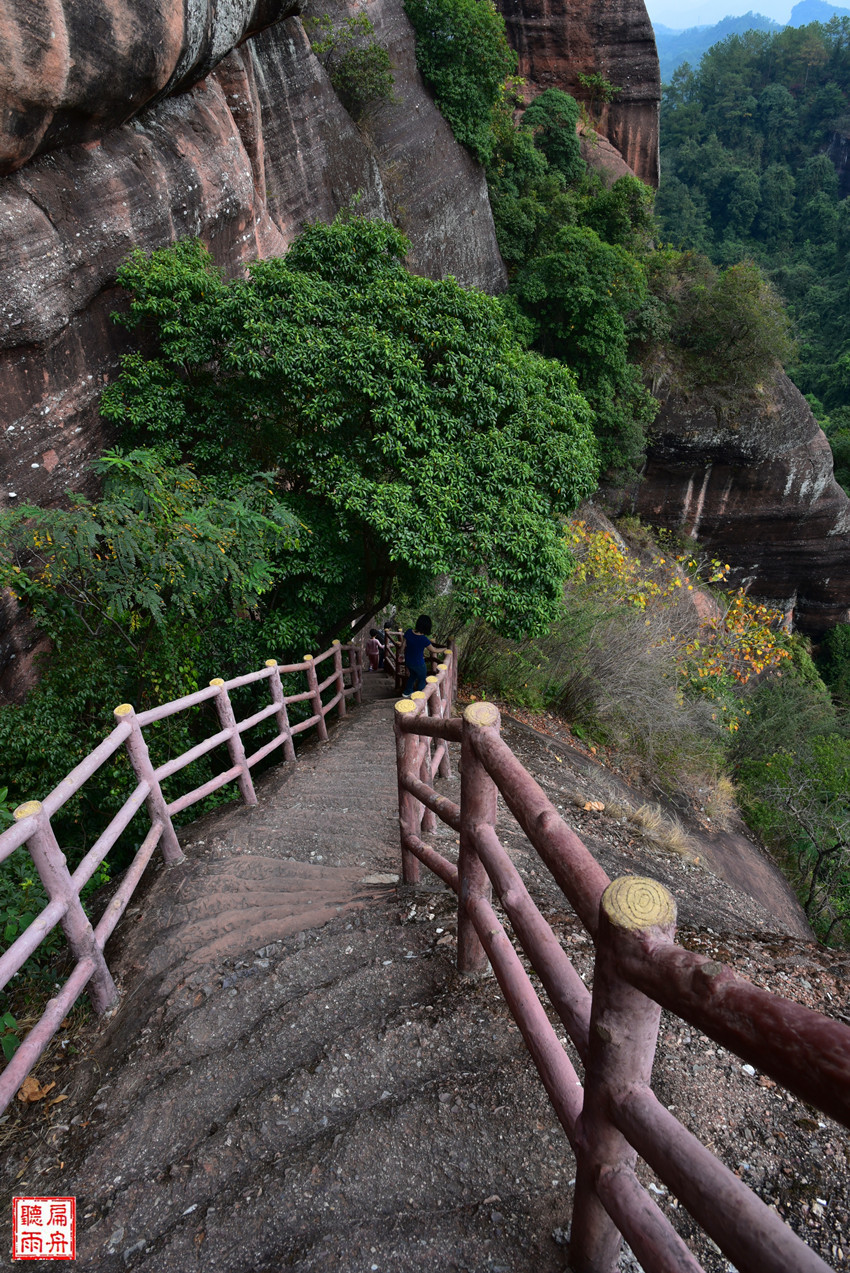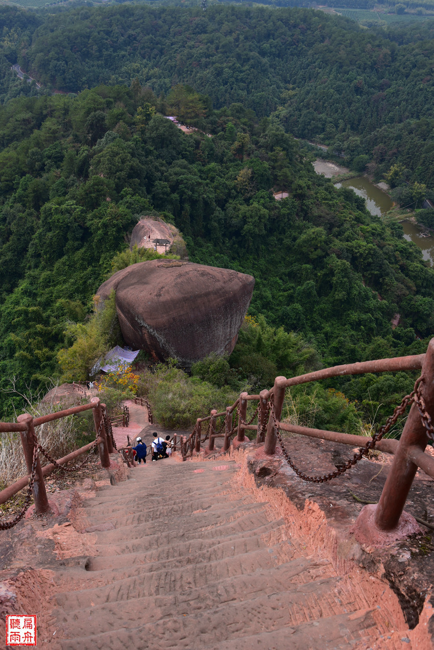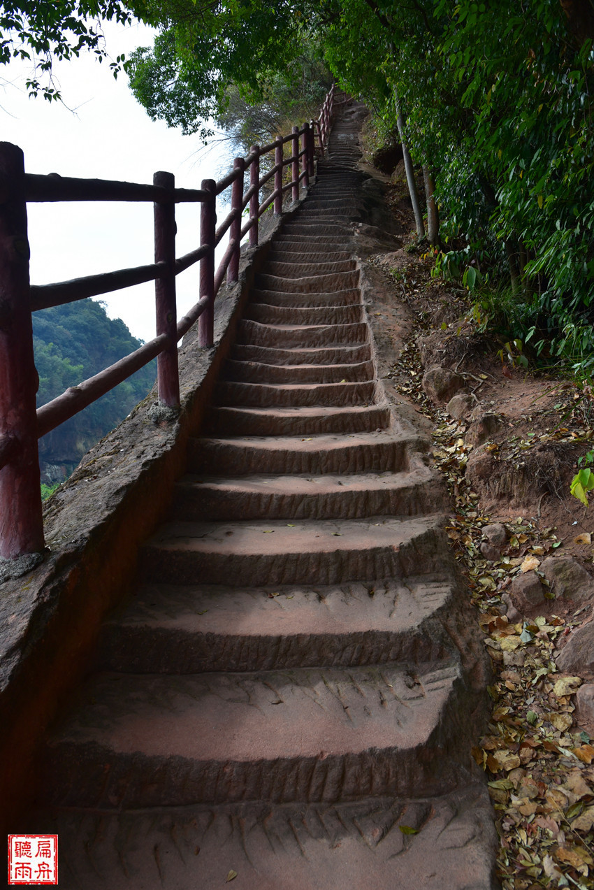 绕墙转到缺口,才知道山门向下依然是骇人的惊险,直上直下,几近90度的台阶,让人刚刚平稳的心脏又有了些许的紧张和忐忑。看着九九天梯上间或露出的人头,开始为自己祈祷:镇定!镇定!胆量!胆量!平安无事!平安无事!这边的路宽多了,够三四个人并肩而行了。