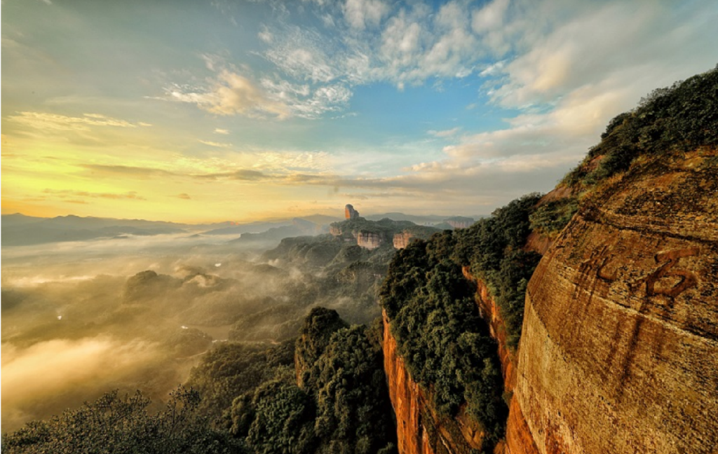 看日出日落的万丈光芒洒在赤壁丹崖上