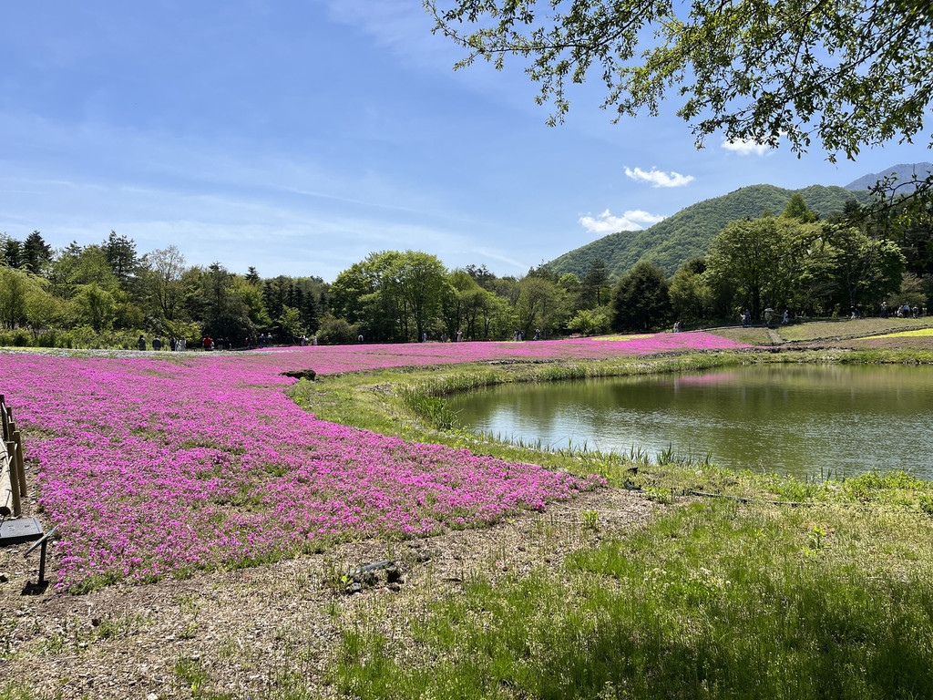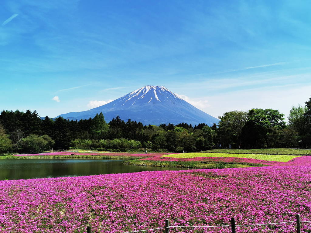 在5月芝樱满地盛开,所以每年此时会有富士芝樱祭,在花园里有多种芝樱 - 福禄考(学名:Phlox drummondii),有淡红色的Giant Rose、Autumn Rose, 有深粉红的McDanie’s Cushion、Scarlet frame, 紫色的Oakington Blue-eye, 白色的Mont-Blanc、Amazing Grace等。日本人喜欢芝樱,因其花语为不张扬,不愿表露,喜欢平静沉稳。今天下午蓝天无云,可以清晰地眺望到富士山。花园里还举办富士美食嘉年华,卖一些当地土特产。
