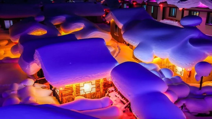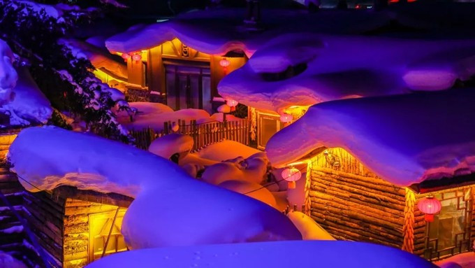 家家灯火,五彩斑斓的灯光映衬着白雪,
