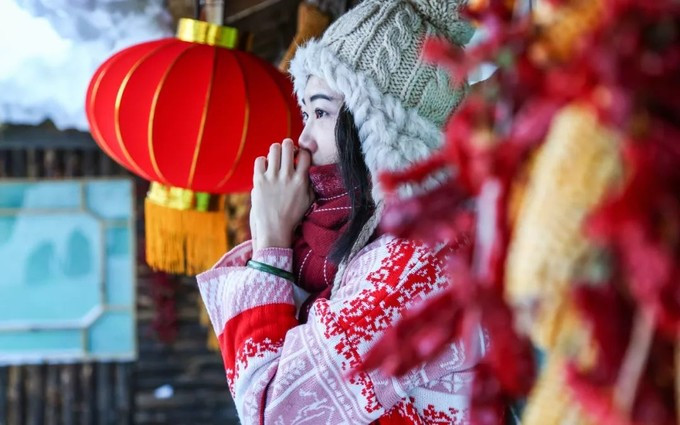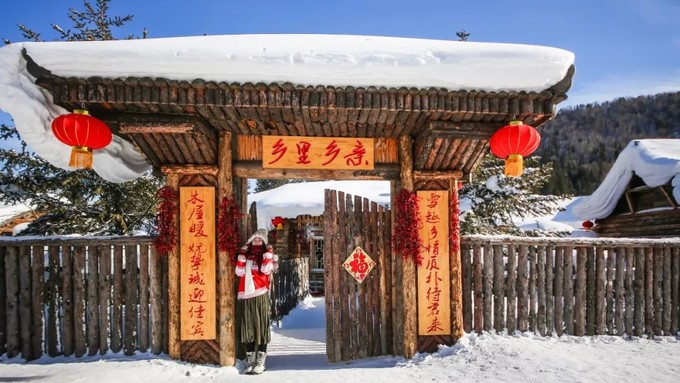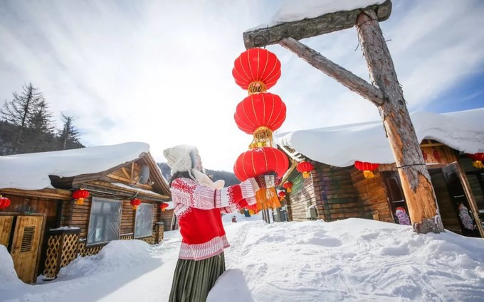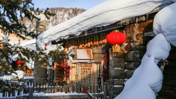伴着夕阳的西下,木刻楞房屋上悬挂的红灯笼逐一被点亮,