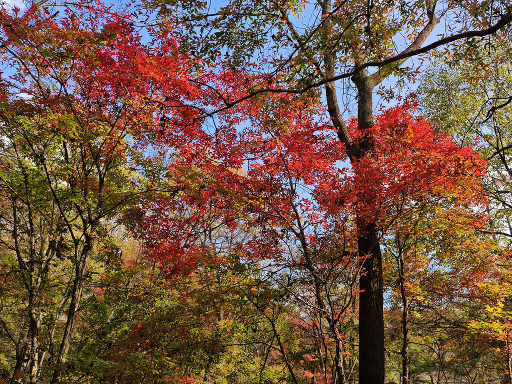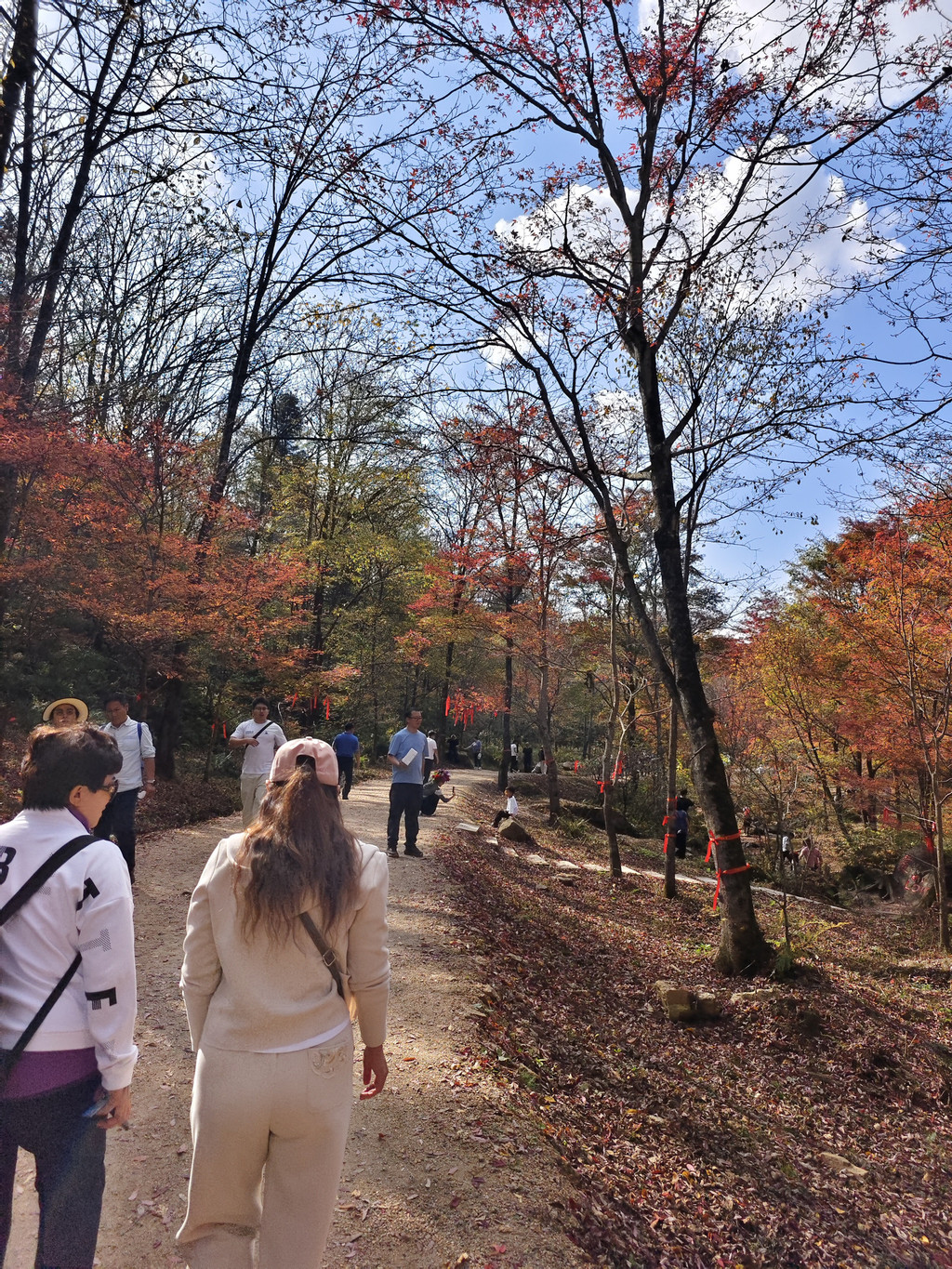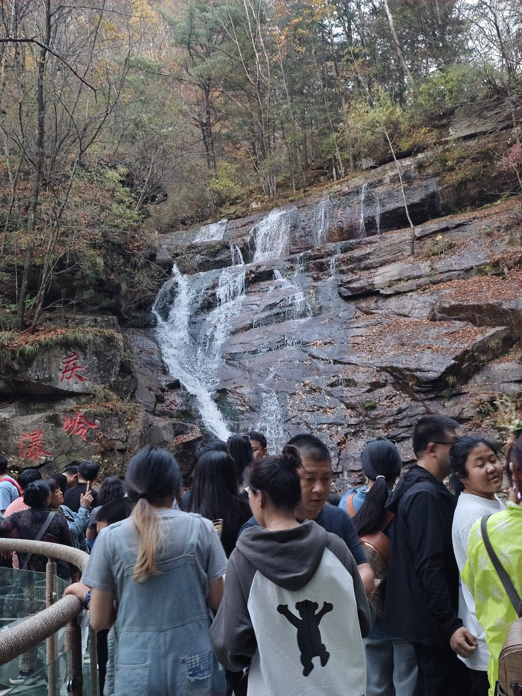 这里要吐槽一下鹿鸣谷,鹿鸣谷全长四公里左右,步行再观景大约需要一个多小时,咱先不说红叶是否红了的问题,咱就说这个景点没有步道板,然后景区还有电瓶车,路面也不是铺装路面,高峰期隔个一两分钟就有一辆电瓶车驶过,人车混行,那灰尘真是一骑绝尘。试想一下步行一个多小时要吸多少灰尘,如果红叶正当时一定要步行的时候,一定一定要戴个口罩,切记切记。如果红叶稀少,该景点建议略过,或者也可以尝试一下坐电瓶车,只是中途停靠站点比较少,走马观花。