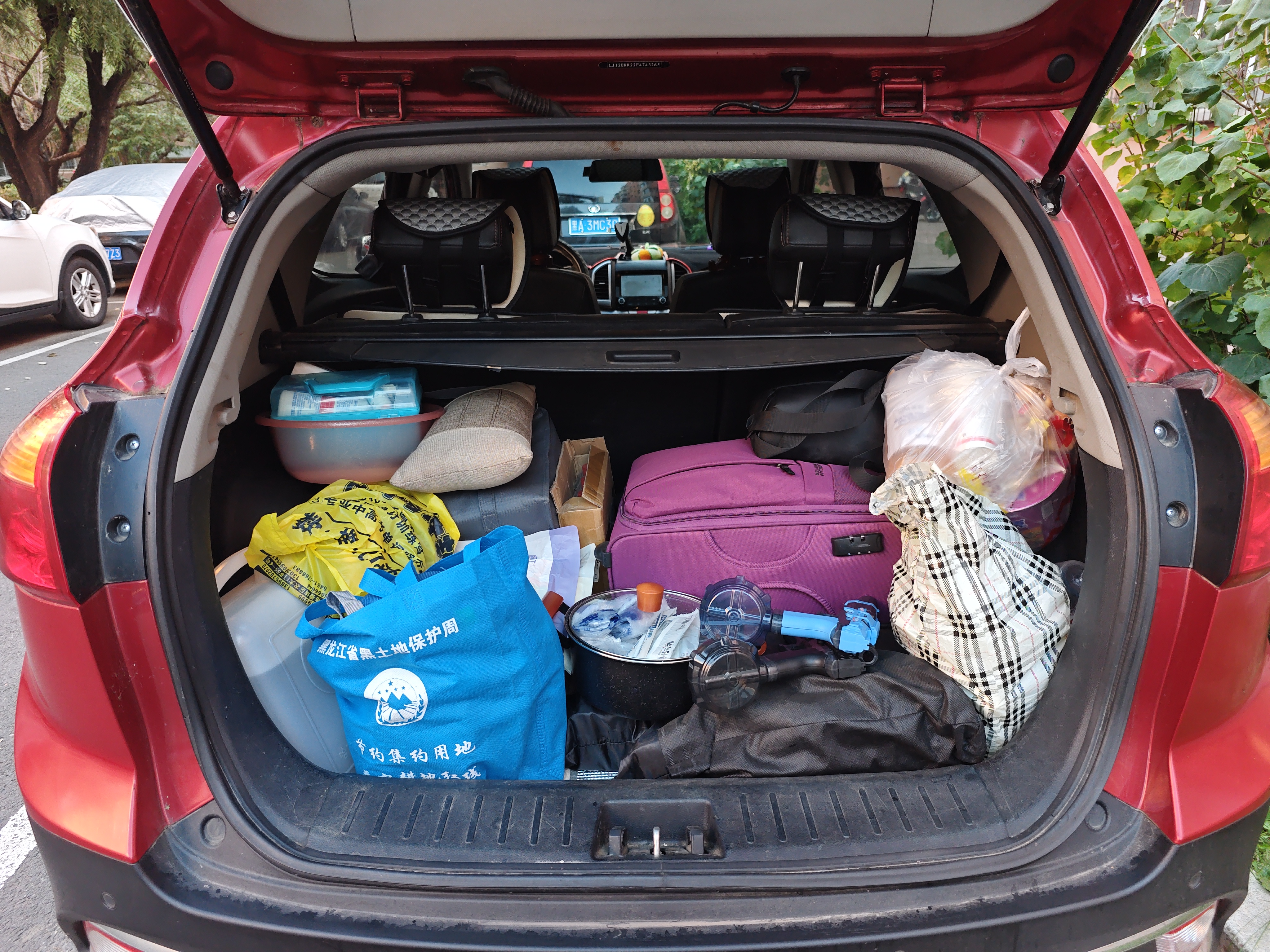 孩子吃的各种零食,方便面,塑料桶装的自来水(10L的塑料桶),卡式炉,气罐,汤锅,露营椅子等,可能要问问啥准备这么多东西,因为是1号出发担心堵车,一旦堵车可以自己解决吃饭问题。吼吼。上图。