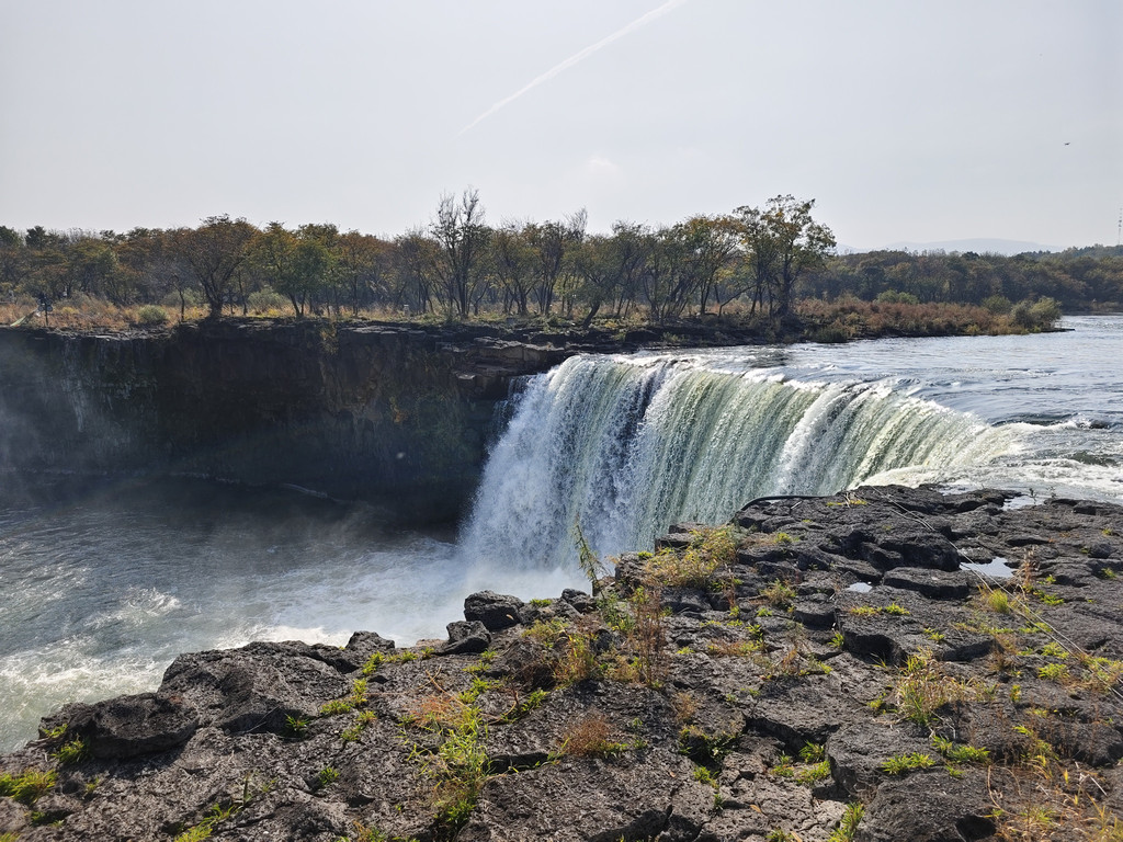 镜泊湖景区还是比较大的,需要坐摆渡车到各个景点。如果只是看瀑布和跳水,那可以在北门走过去即可,不用十分钟,游湖则需要坐摆渡船到码头。镜泊湖的吊水楼瀑布还是可以看一下的,如果想看瀑布跳水,那一定要早点去占个好位置。我是早上九点左右进的景区,正好十点有一场跳水表演,但是对这个表演的火热程度估计不足,结果没有占到好位置,这里就简单的拍了照,