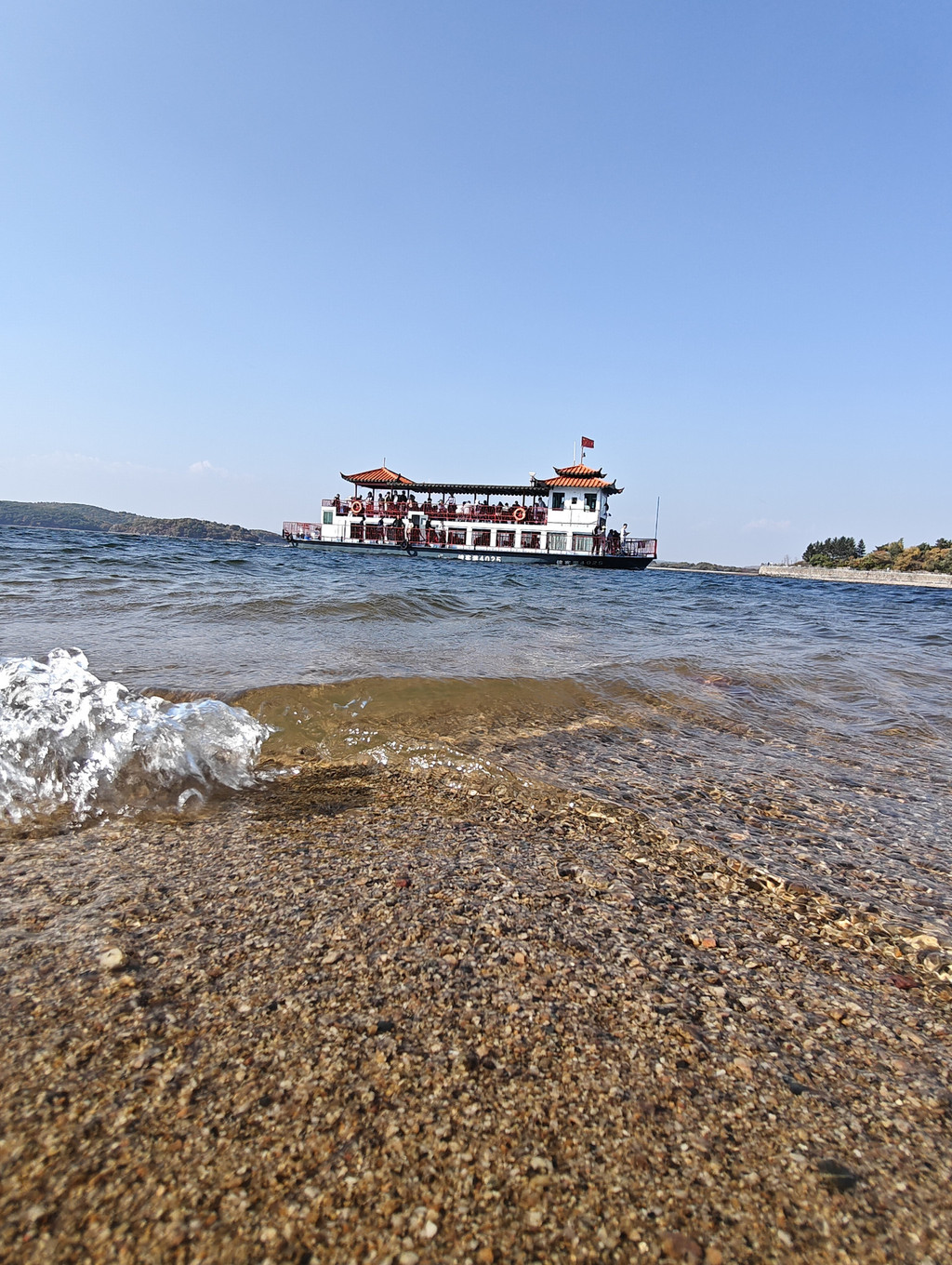 从瀑布到码头需要乘摆渡车,十分钟左右,当然也可以步行过去,有木栈道,这里根据个人喜好选择。网上有很多攻略推荐先去码头乘船,如果规划好时间,从码头步行回瀑布,那可以先游览码头,再看跳水,否则排摆渡车,可能会耽误看演出的时间,因此个人建议先看演出后到码头边坐船玩水,因为我们带着孩子,孩子也爱玩沙子和水,因此我们选择后到码头。