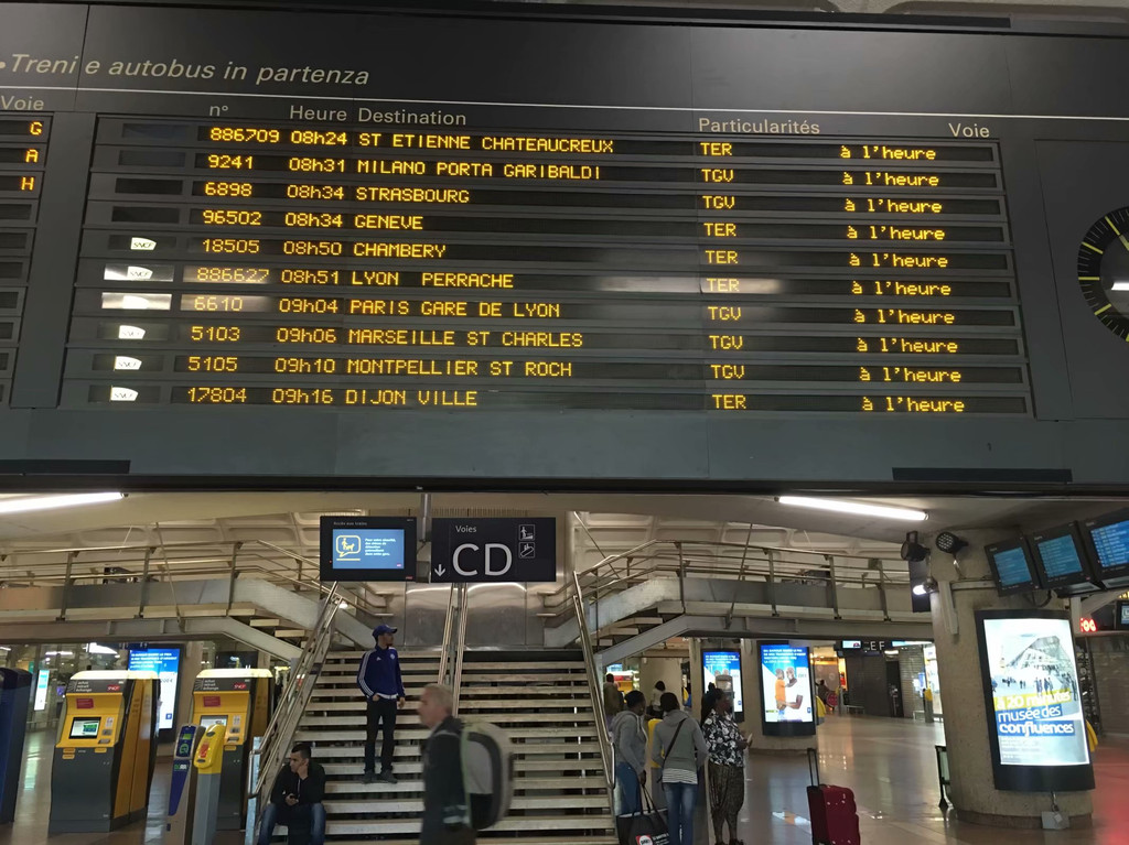 火急火燎赶到火车站,结果火车取消,后来知道是法国工人巴工。等了3个小时,终于下午3点多出发了,结果在里昂转车的时候,下一趟火车又取消了,只能在里昂过夜!WTF!