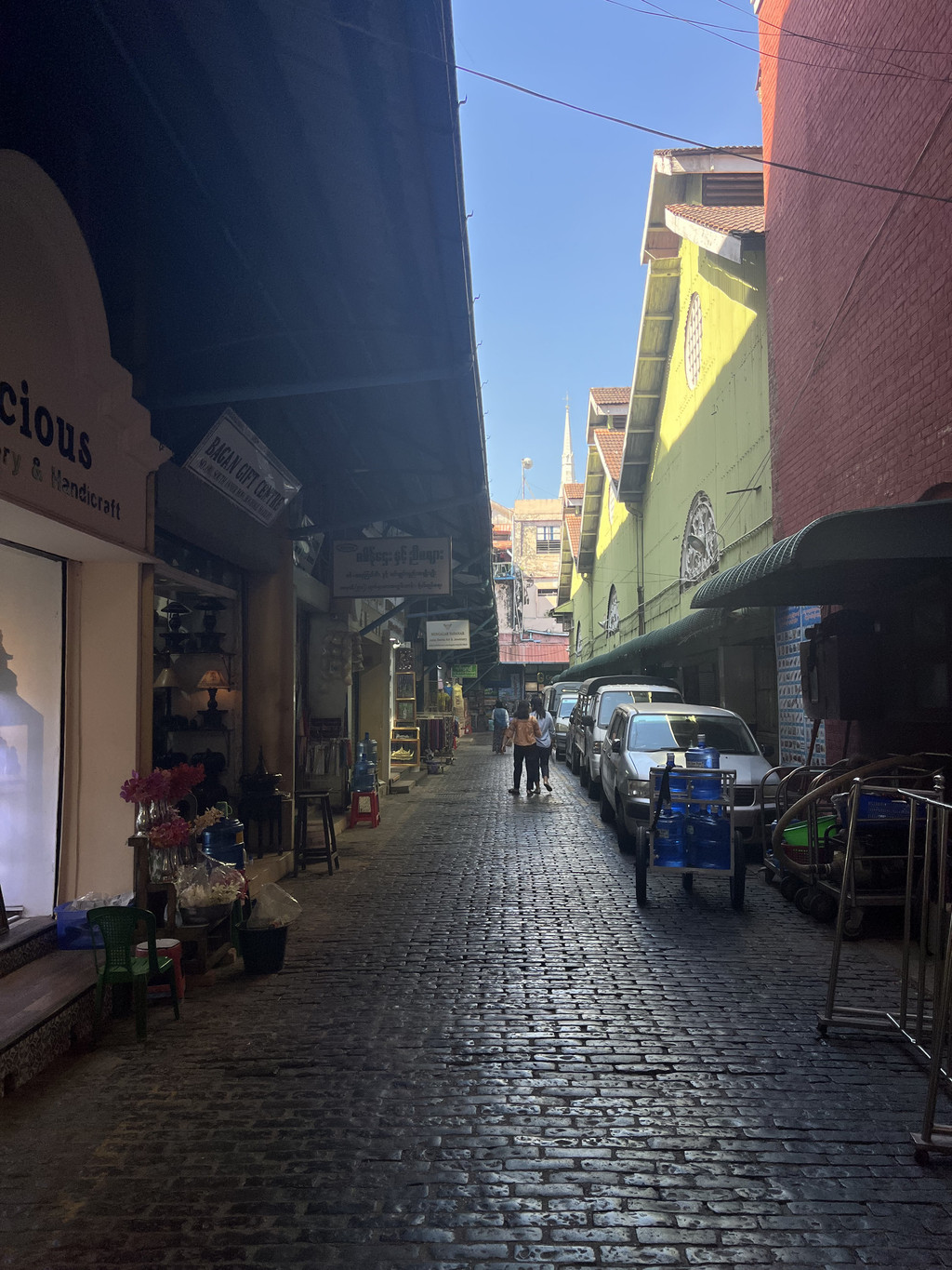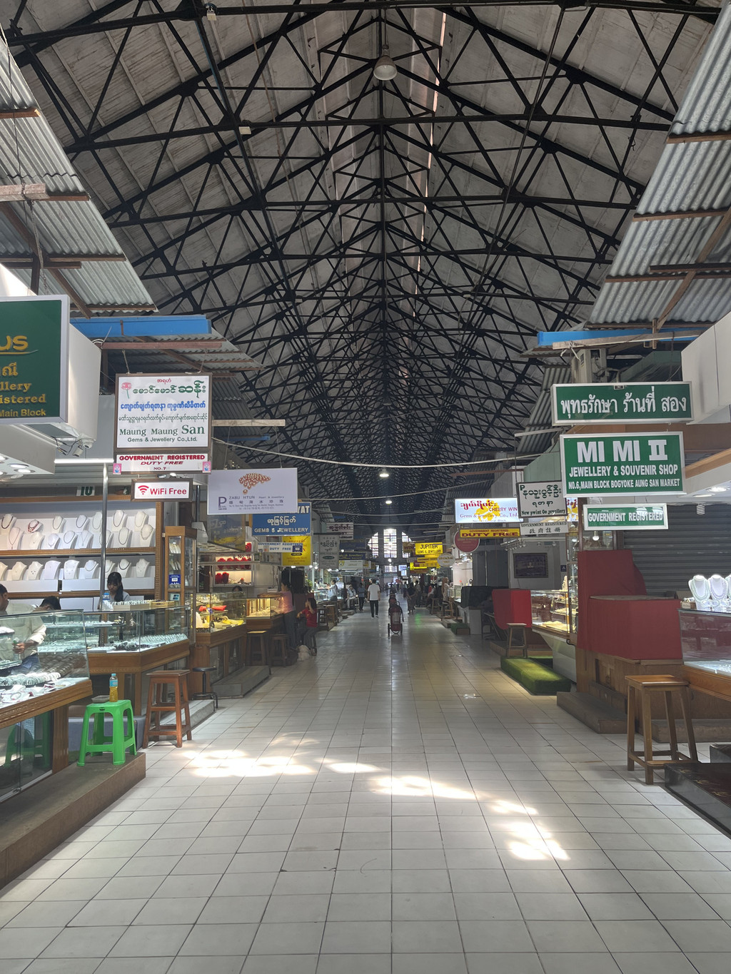 昂山市场是市中心最热闹的及时,用鹅卵石铺成的步行街,里面珠宝首饰聆郎满目,可以购买到缅甸盛产的金珍珠。分布着缅甸传统手工艺品漆器、竹编、服装等区域,一间间画廊隐匿在市场里。昂山市场周二到周日9:00—17:00营业。昂山市场对面就是仰光最大的购物中心junction city。