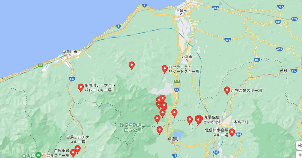 在这一板块地区,妙高、上越及糸鱼川三大区域加起来的话,共有13个滑雪场。