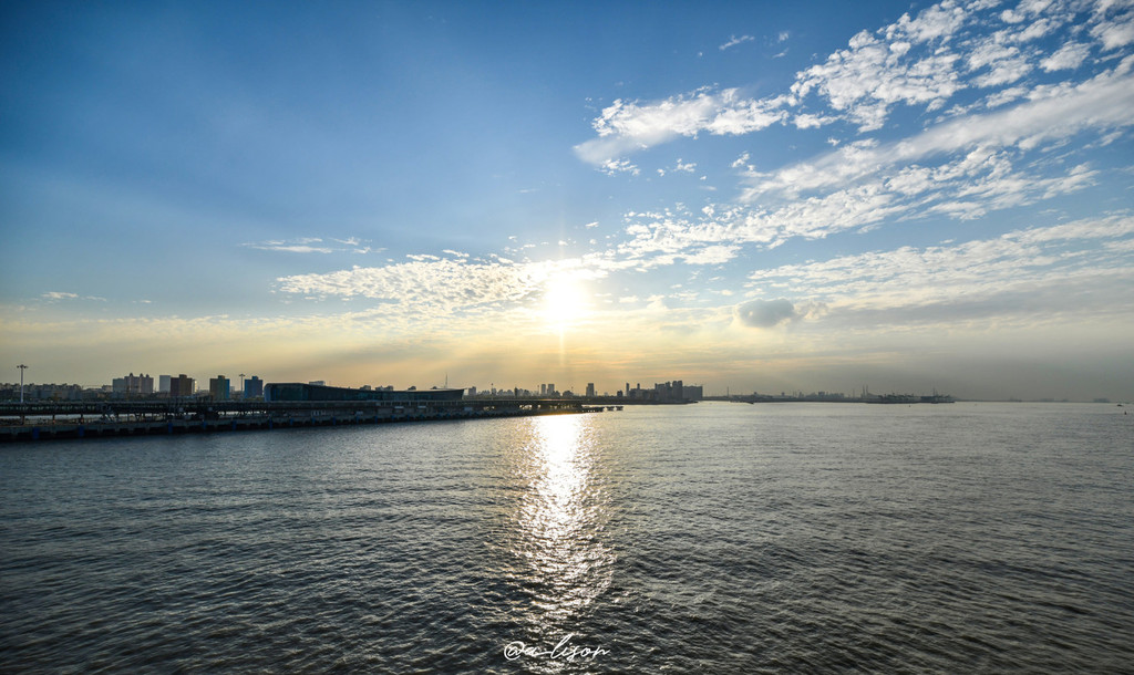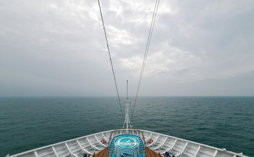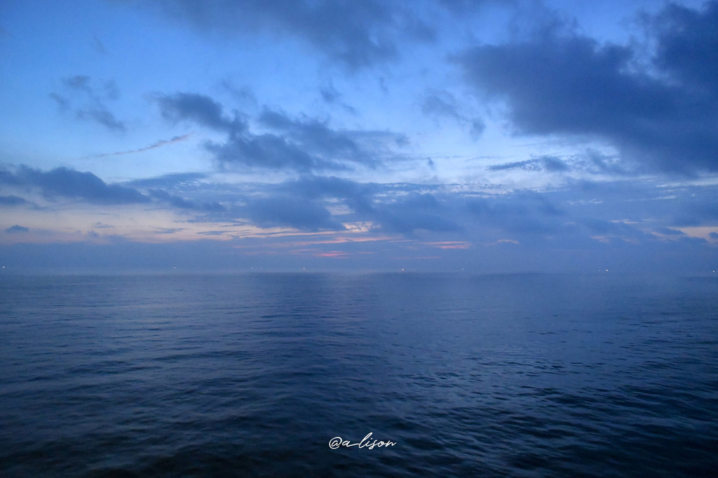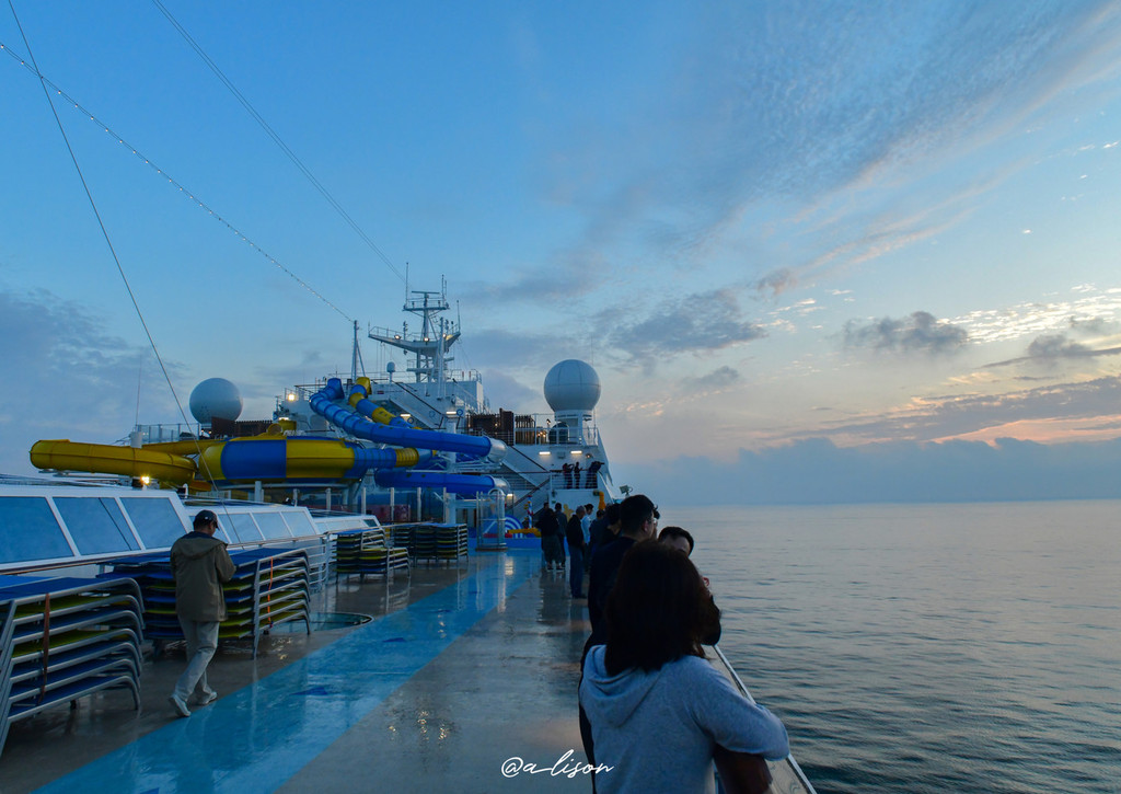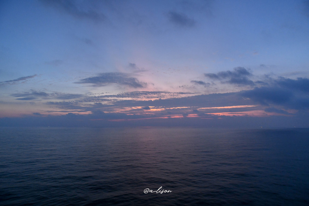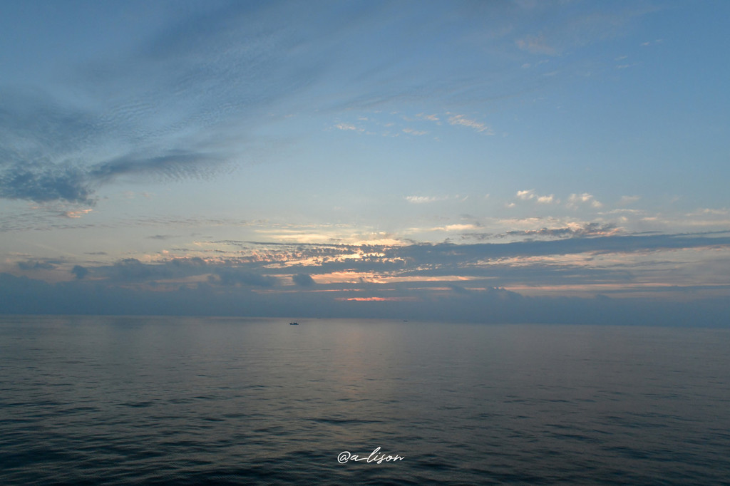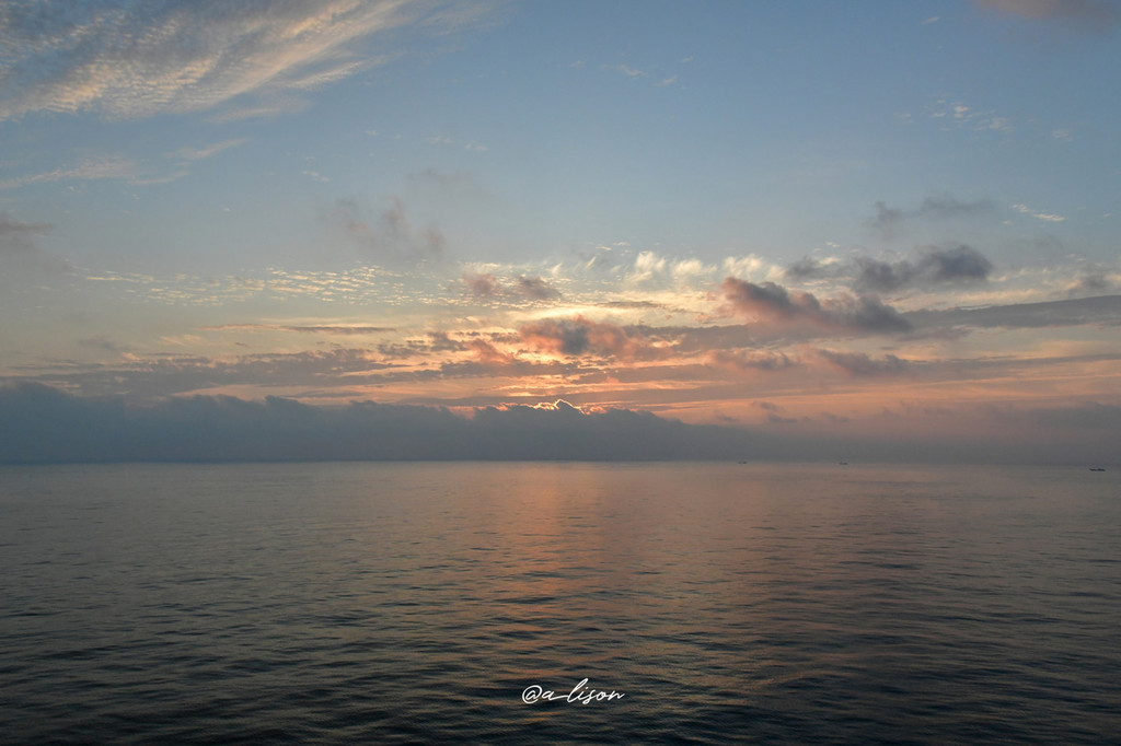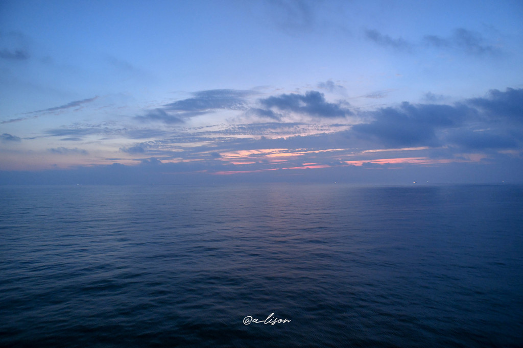 船上第一个航行日没看到海上日出,但是云雾散开后太阳出来了,拍到的天空也是很有层次感的样子。
