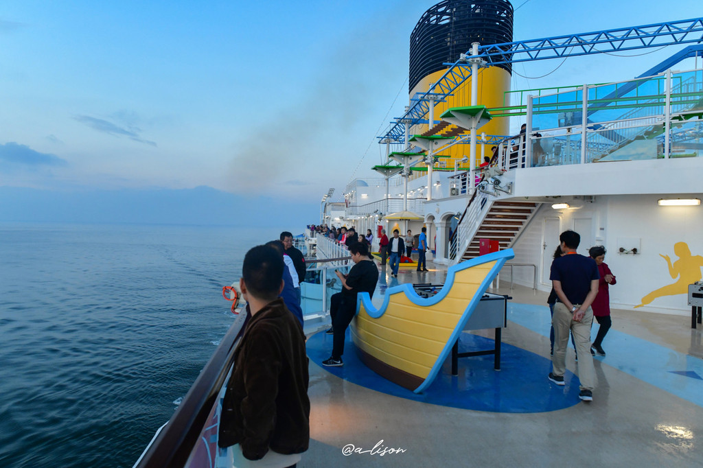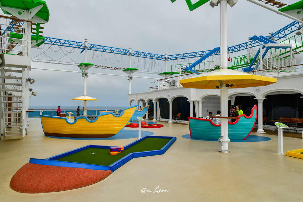夜晚的甲板区域比较安静,白天的甲板就是人流攒动了。白天的儿童区,家长带着小朋友都在这里活动