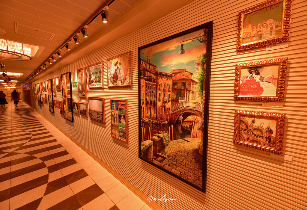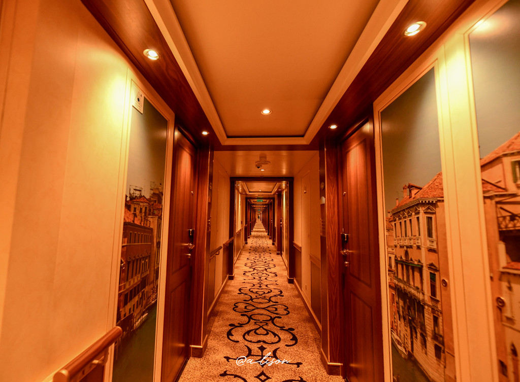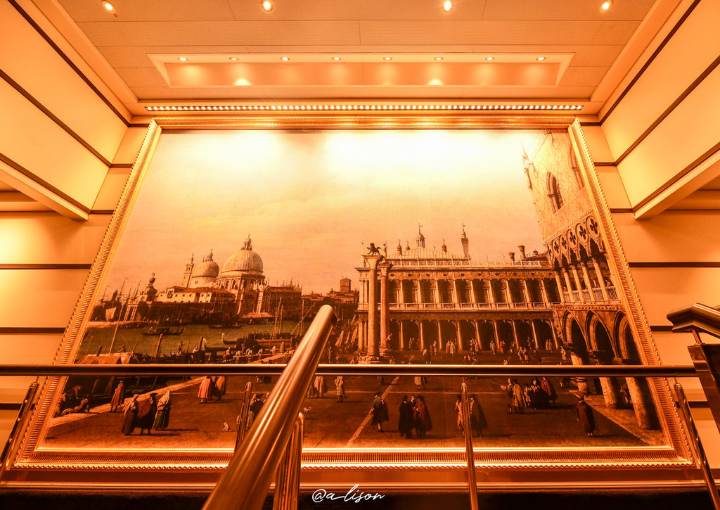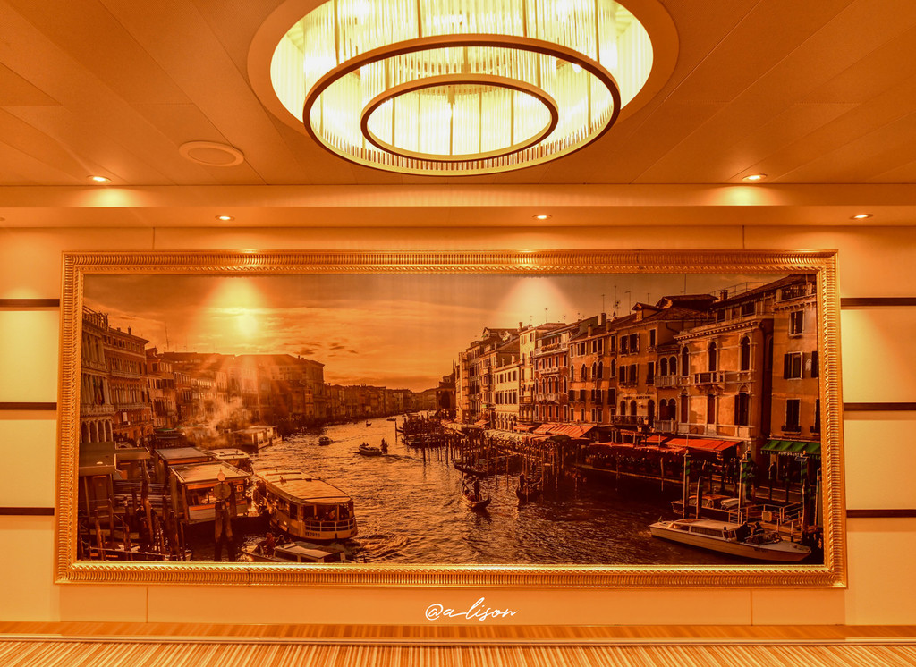 纯正意式血统的邮轮当然哪里都不会缺少意式元素,走廊这里可以看到威尼斯景观的壁画,让人感觉仿佛走在威尼斯街头。