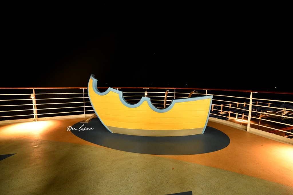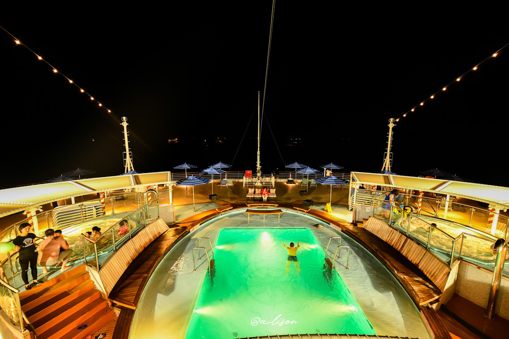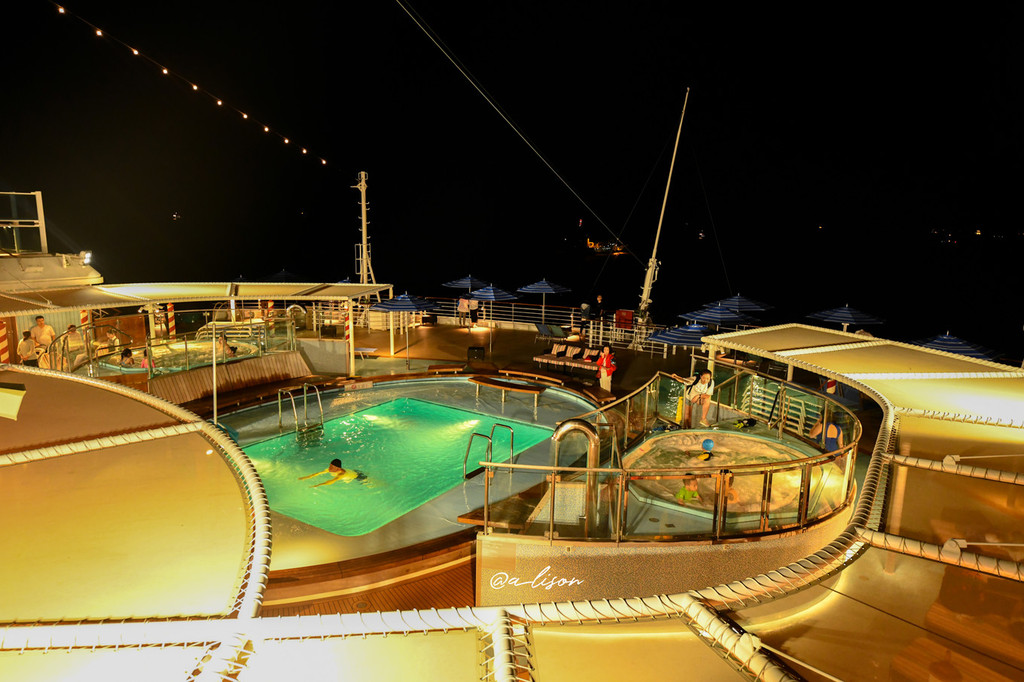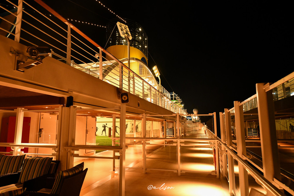 我拿着相机在船舱里晃悠了一圈,决定趁着天气好到室外转转~go!!!夜晚的甲板亮堂堂的,慢步走在上面听听海浪声,吹吹海风不失为散步的好地方,当然也有人穿着跑步的装备在甲板上夜跑了