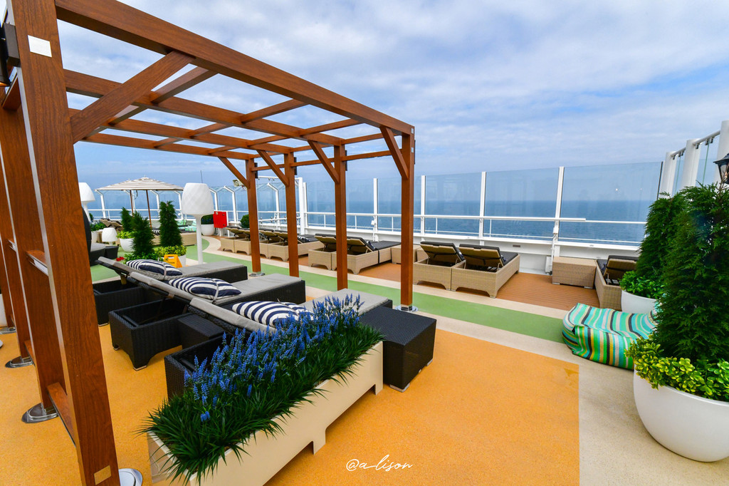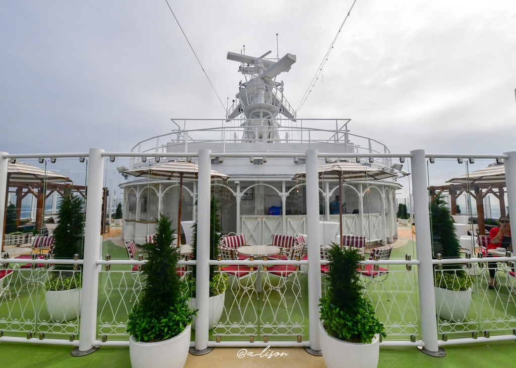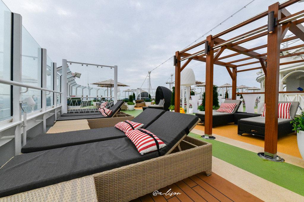 15层的威尼斯空中花园(5美元/人)是躺着晒太阳放松的好地方。最后一个航海日上午还是多云天,太阳在云里窜来窜去,光线也是时好时坏的。