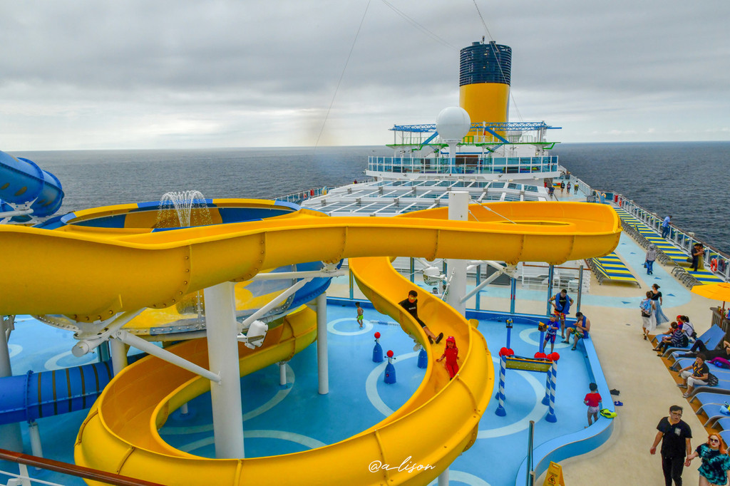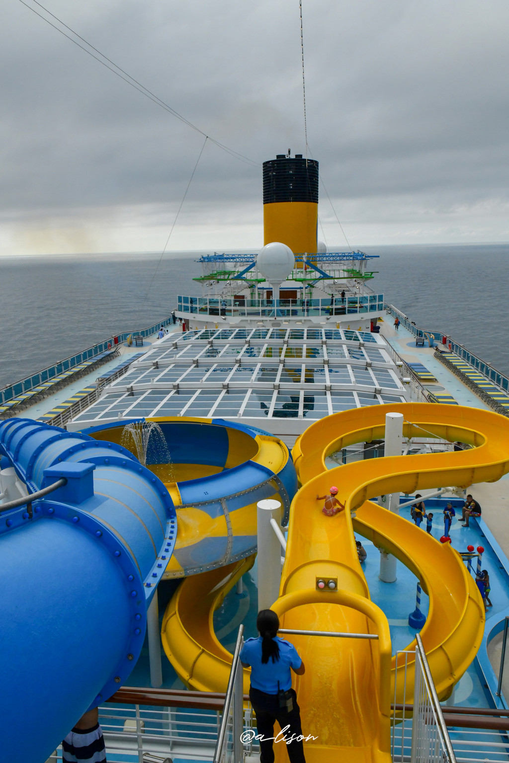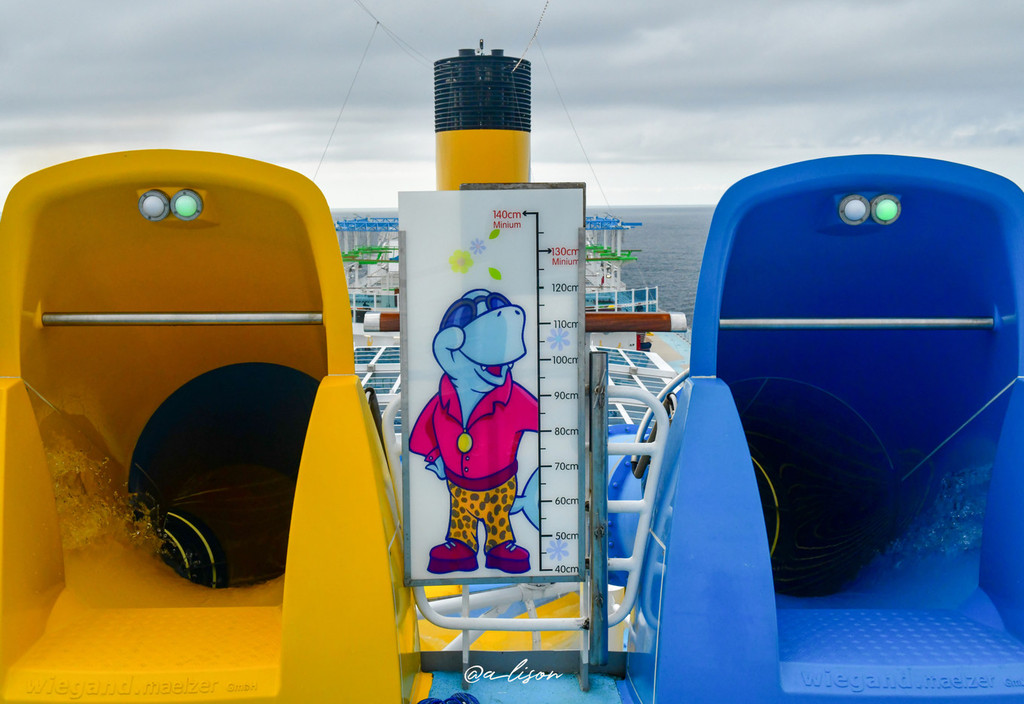 说说船上最刺激的也是免费的水上滑道项目~~实际一共有3个道,13楼1个儿童通道,因为层高低一些所以相对下落速度缓一点,14楼有2个通道 ,黄色的更刺激,蓝色的相对缓一些,3个通道处都有工作人员值班放行确保游玩安全,不爱玩水的我自然没有尝试