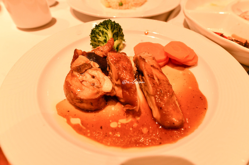 刚上船的第一天晚餐我们去的3楼圣马可大堂旁边的马可波罗餐厅,跟当天上船第一顿在10楼丽都市集自助餐厅吃的东西相比,其实菜品都差不多,无非就是自助变成了一盘盘的菜由员工端上桌。