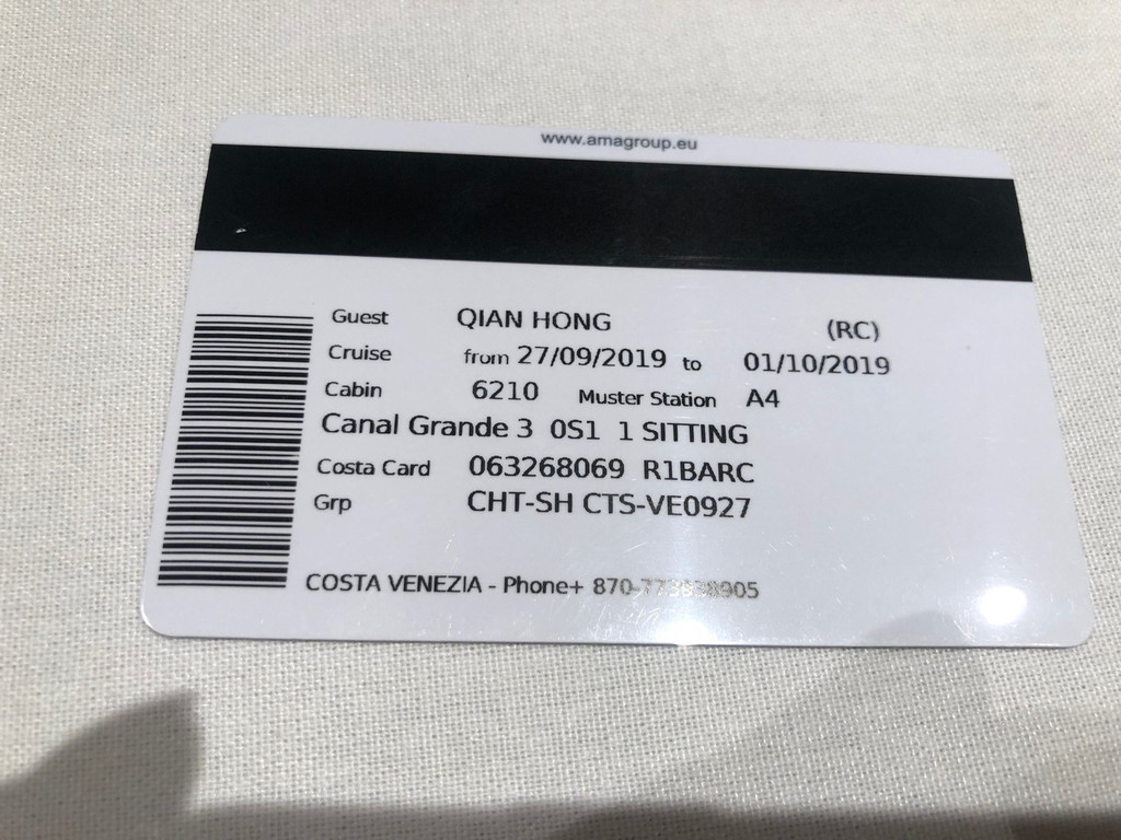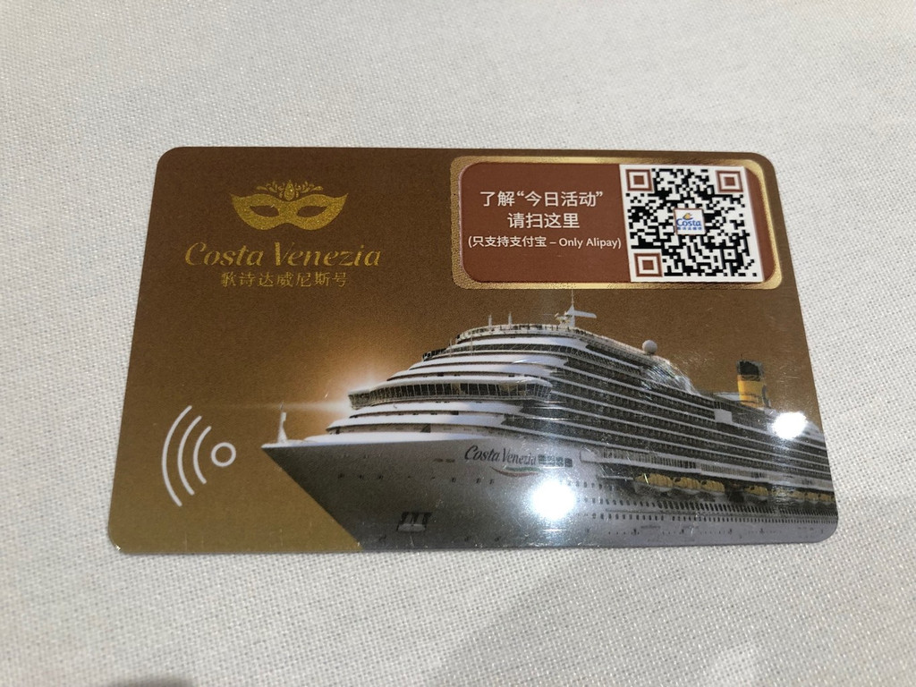 船上是没有网络的,准确的说船上的网络是需要付费购买的,这应该是很多人最关心的,不过可以放心的是船上的Wi-Fi可以畅通无阻地使用支付宝。每个人登船都有一张对应自己名字的房卡,我们的房卡是放在房间桌上的,进房间就看到了。登陆邮轮上的wifi用支付宝扫房卡正面二维码,然后再扫房卡背面条形码就可以绑定支付宝。