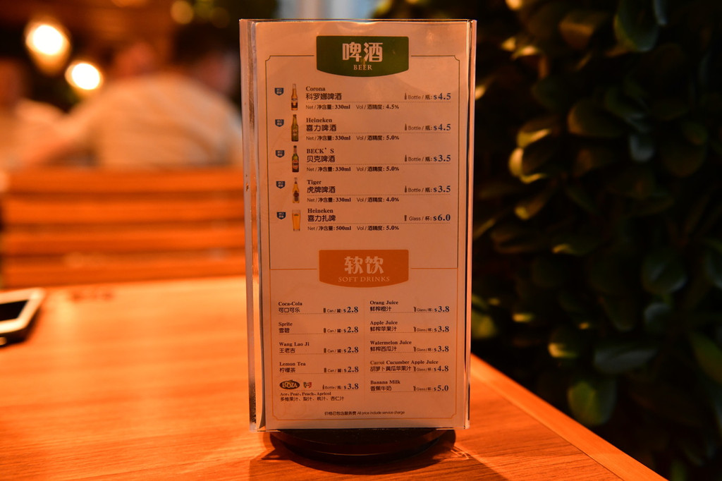 餐厅的瓶装矿泉水和啤酒价格立牌,可按需购买品尝啊哈
