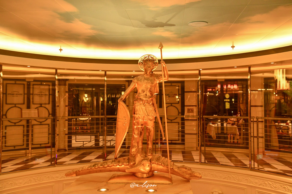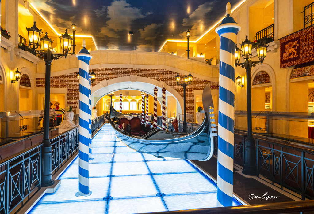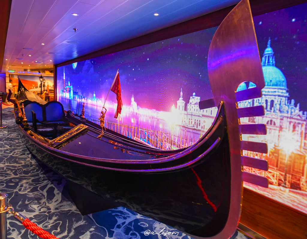 餐厅和酒吧区域也能找到各种能拍拍拍的元素。提到巴黎,让人情不自禁地想起埃菲尔铁塔;提到威尼斯,那一定会想到摇曳的贡多拉,在邮轮里就能看到这个威尼斯最具代表性的标志物。3楼大运河餐厅里精美的贡多拉似乎刚刚穿过叹息桥,让人仿佛摇曳在威尼斯城中