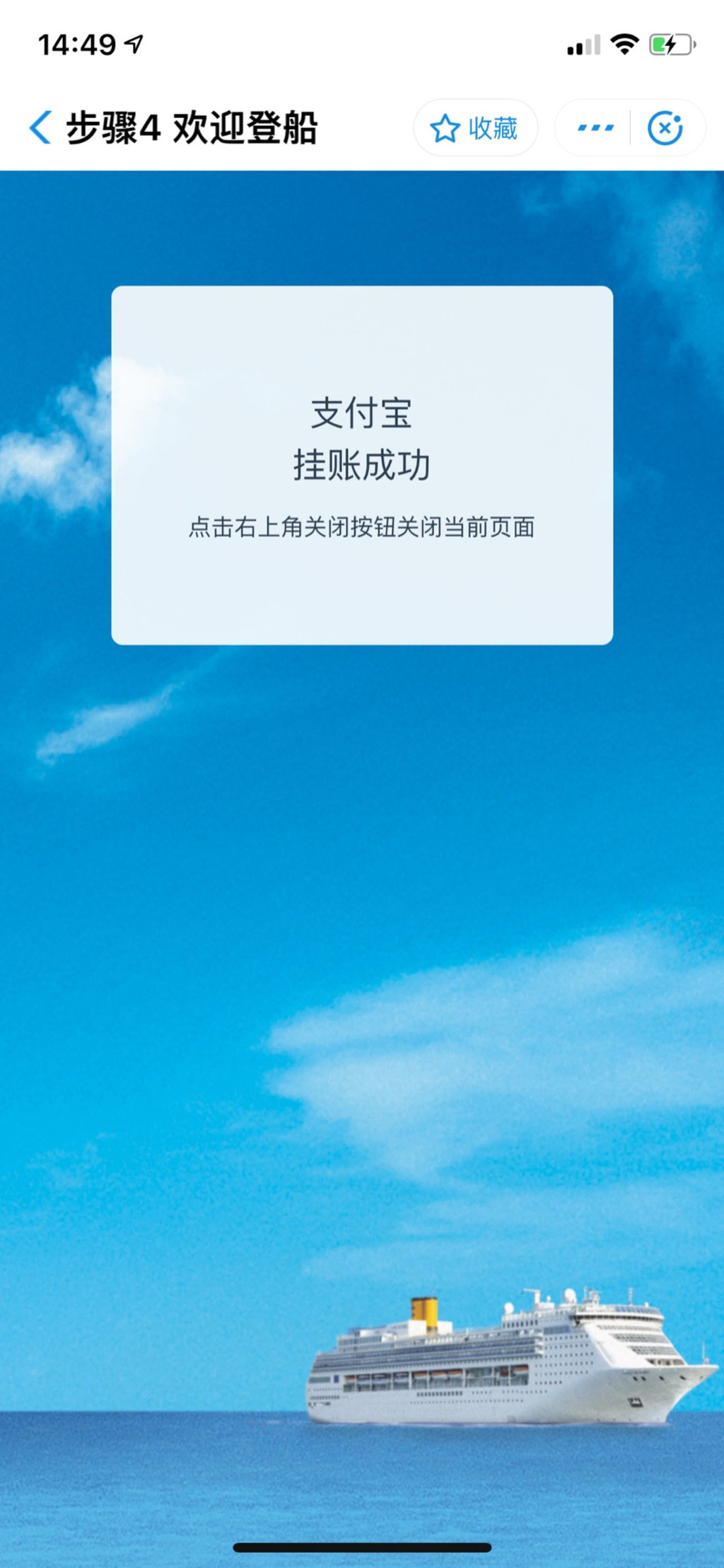 提醒:可以提前在手机支付宝app上搜索“在线值船”,用于船上税费/服务费支付以及相关消费支付,这边船上费用支付扣款建议挂扣信用卡,最后一天下船前挂扣储蓄卡和现金的游客需要排队到服务台办理扣费,手续会非常麻烦,如果未有效清帐会无法下船造成不必要的麻烦。