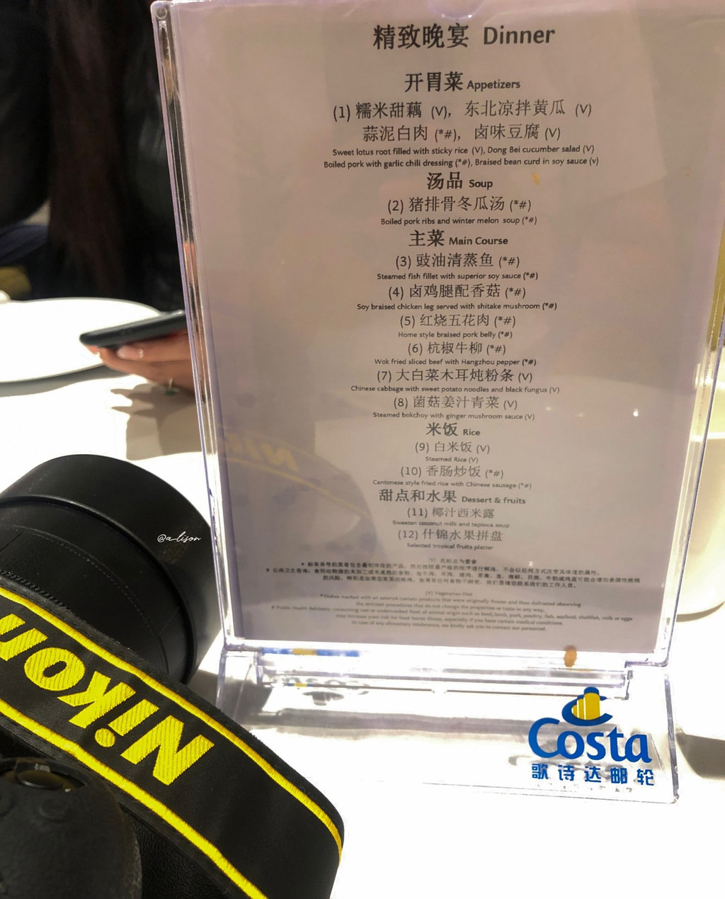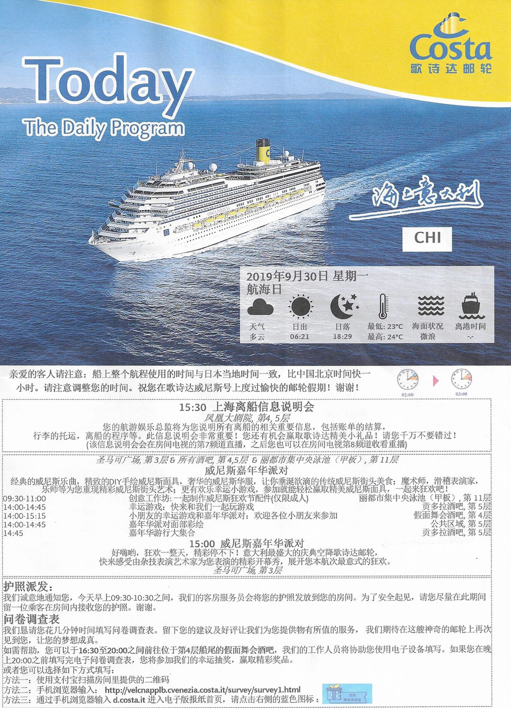 这里要特别提到我们客舱服务员真的很友好,尽管语言不通英文也有口音,但是整体服务真的非常nice。每天我们进出房间经过过道碰到他,他都会热情微笑跟我们打招呼,必须给他打CALL~!如果你觉得扫房卡看每天的活动情况很麻烦,可以找客舱服务员拿船上的每日详单。这是最后一天的详单,上面还有离船具体安排须知